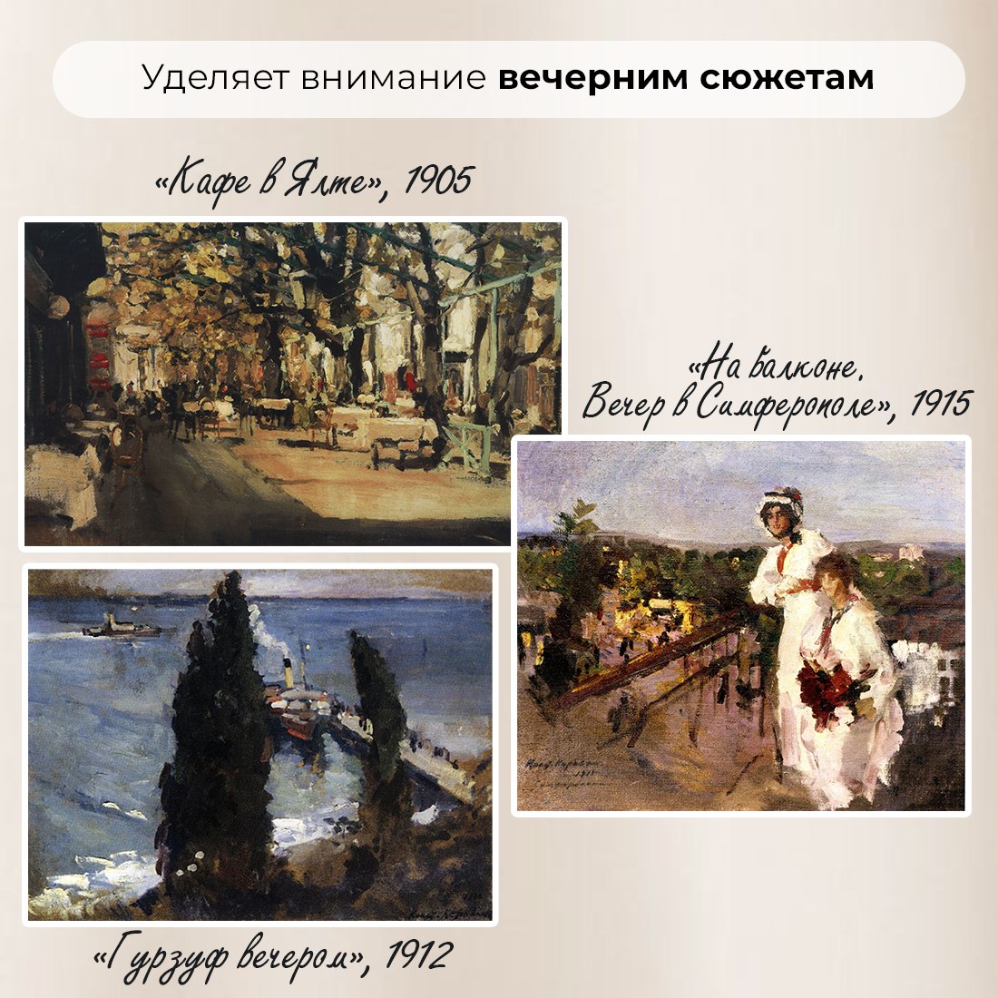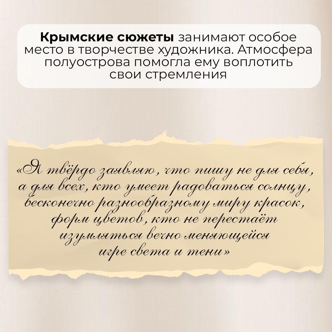 Будучи истинным «певцом радости», творец в своих произведениях, наполненных светом и красками, тонко передавал ощущение жизни. Именно Крым с его пышной природой дарил художнику вдохновение для создания шедевров, которые узнают во всём мире.