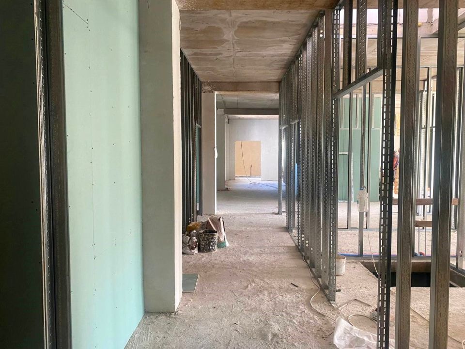 На текущий день ведётся устройство кровли, приямков, перегородок из гипсокартонных листов и электрических сетей внутри здания. Также штукатурятся стены, разрабатывается грунт под подпорную стену-2 и под теплотрассу, осуществляется устройство водопровода и отопления, вынос электросетей и отсыпка подвала отсевом.