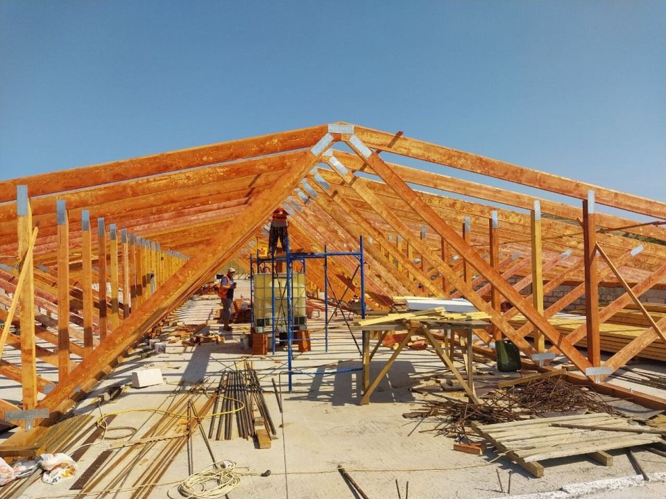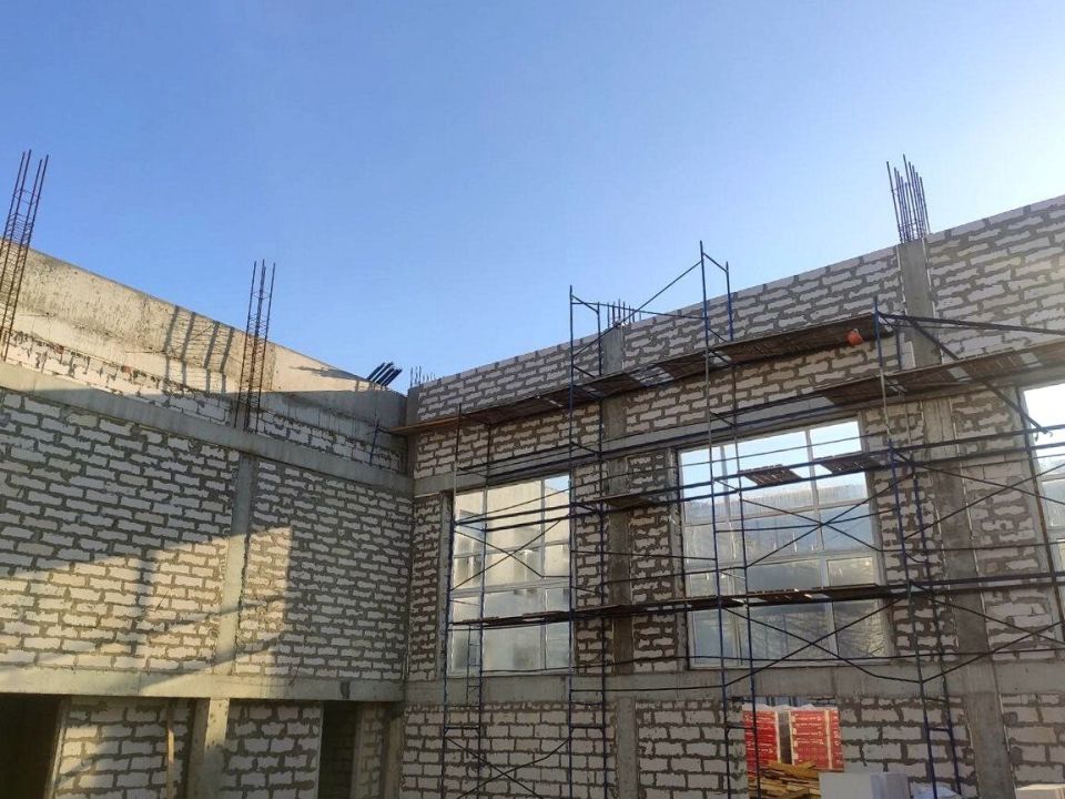 Сегодня ведется устройство кровли, кладка стен и перегородок, разработка траншей, укладка труб. Также устанавливаются колодцы наружных сетей водоснабжения и канализации, изготавливаются стойки усиления кладки, закладных деталей. Продолжаются электромонтажные работы и благоустройство территории.