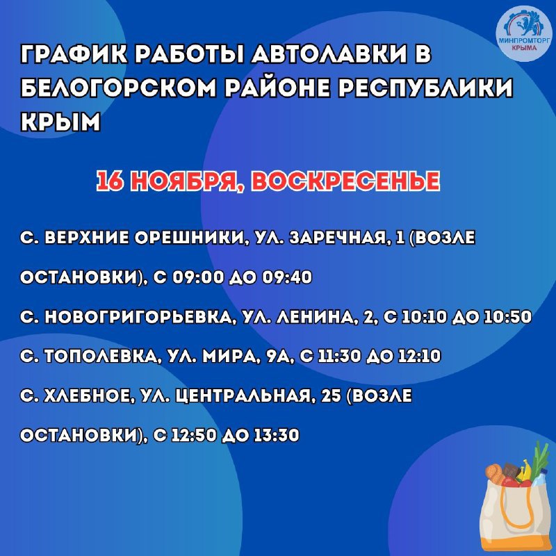В это воскресенье, 16 ноября, жители Белогорского района смогут приобрести продовольственные товары по адресам, которые мы указали в этом посте. Всего для продажи будут доступны 100 позиций товаров, которые были выбраны для продажи в соответствии с пожеланиями жителей населённых пунктов.