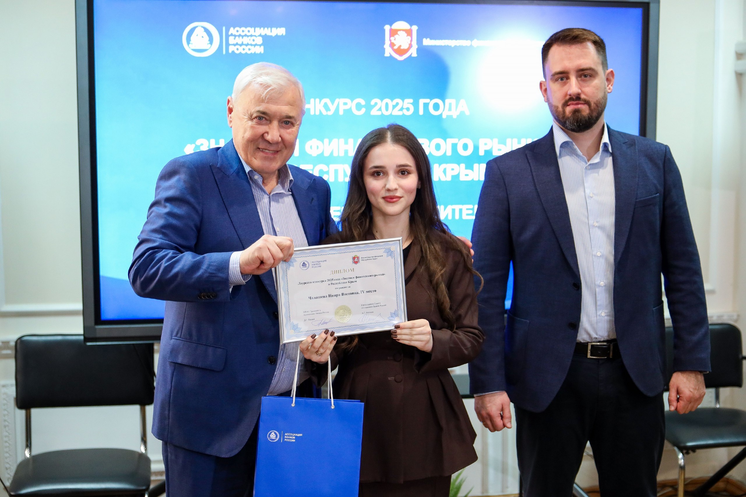 Председатель Совета Ассоциации банков России Анатолий Аксаков и зампредседателя Совета министров РК – министр финансов Крыма Ирина Кивико вручили награды победителям конкурса «Знатоки финансового ранка»-2025, проводимого на территории республики.