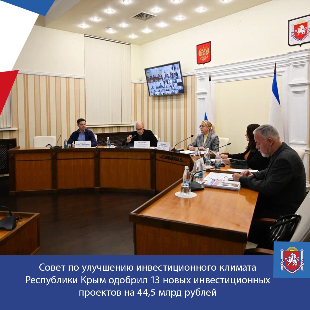 Совет по улучшению инвестиционного климата Республики Крым одобрил 13 новых инвестиционных проектов с общим объемом капиталовложений 44,5 млрд рублей.