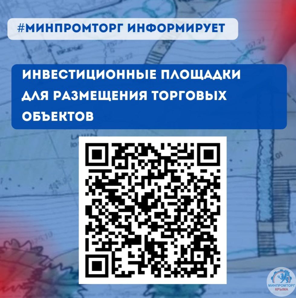 Информация о свободных земельных участках для торговых объектов размещена на сайте Минпромторга Крыма, а также доступна по QR-коду.