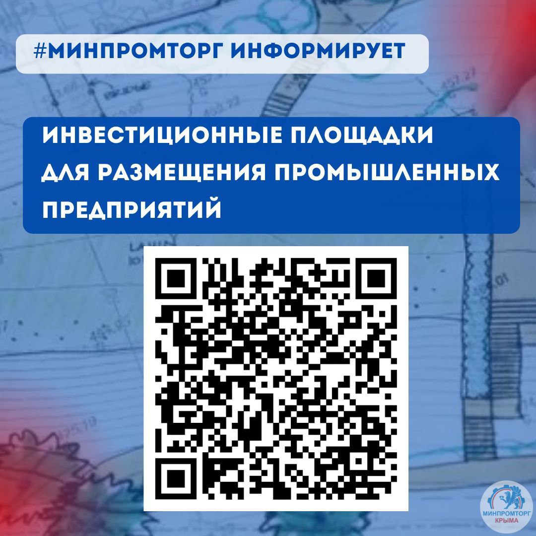 Информация об инвестиционных площадках для промышленных предприятий размещена на сайте Минпромторга Крыма, а также доступна по QR-коду.