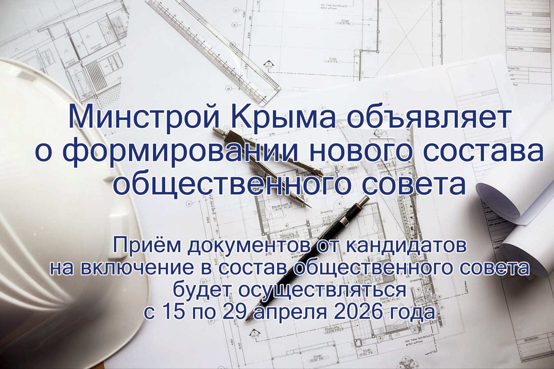 Министерство строительства и архитектуры Республики Крым информирует о начале формирования нового состава общественного совета при ведомстве. Основанием для проведения данной процедуры является соответствующий приказ Министерства от 09.04.2026 № 65.