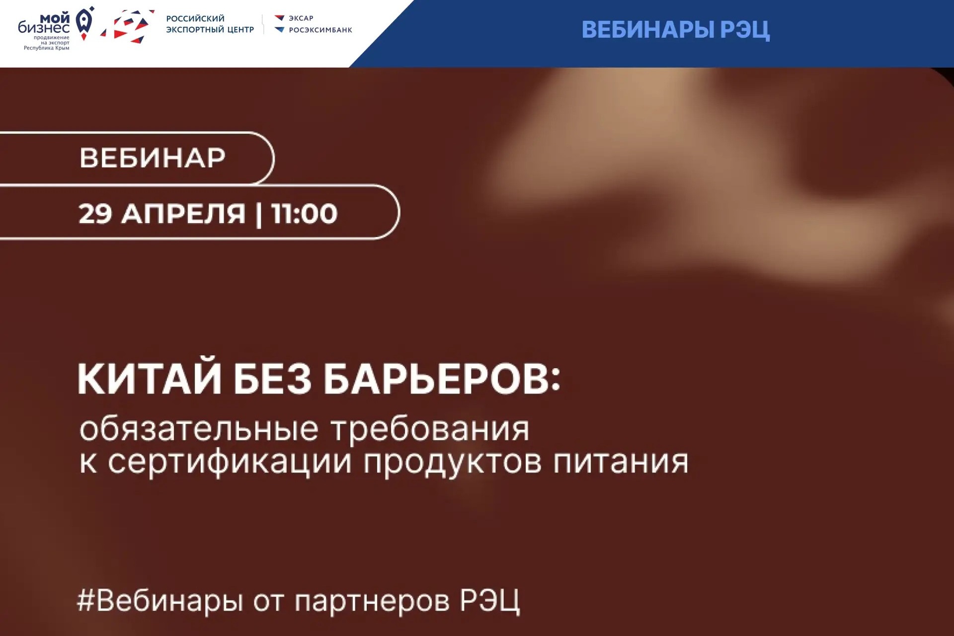 В рамках реализации нацпроекта «Международная кооперация и экспорт» представители крымских экспортно ориентированных предприятий смогут принять участие в вебинаре Российского экспортного центра «Китай без барьеров: обязательные требования к сертификации продуктов питания».
