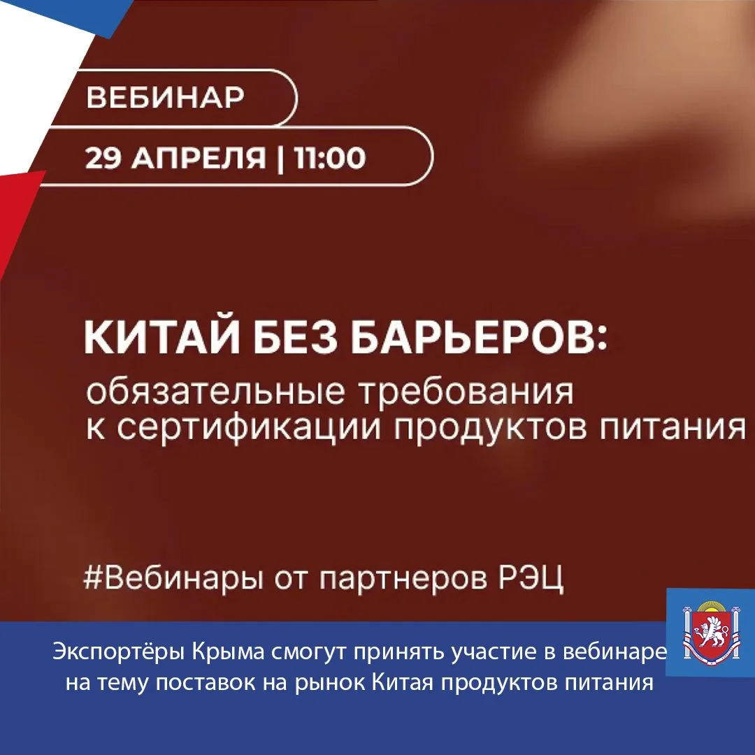 Экспортёры Крыма смогут принять участие в вебинаре на тему поставок на рынок Китая продуктов питания.