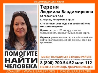 В Алупке волонтеры разыскивают 54-летнюю Людмилу Тереню. Об этом сообщили в поисковом отряде "Лиза Алерт". С 10 октября 2025 года нет сведений о её местонахождении. Приметы: Внешность: Рост около 165 см, худощавого телосложения....