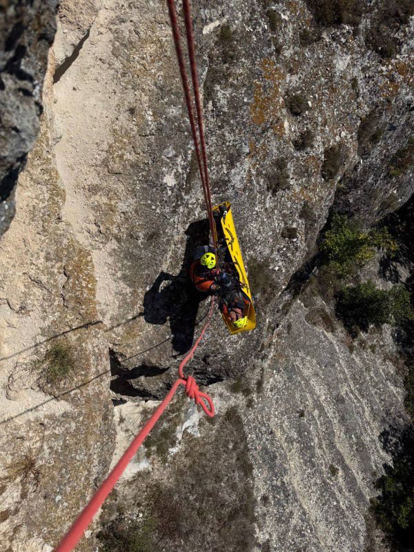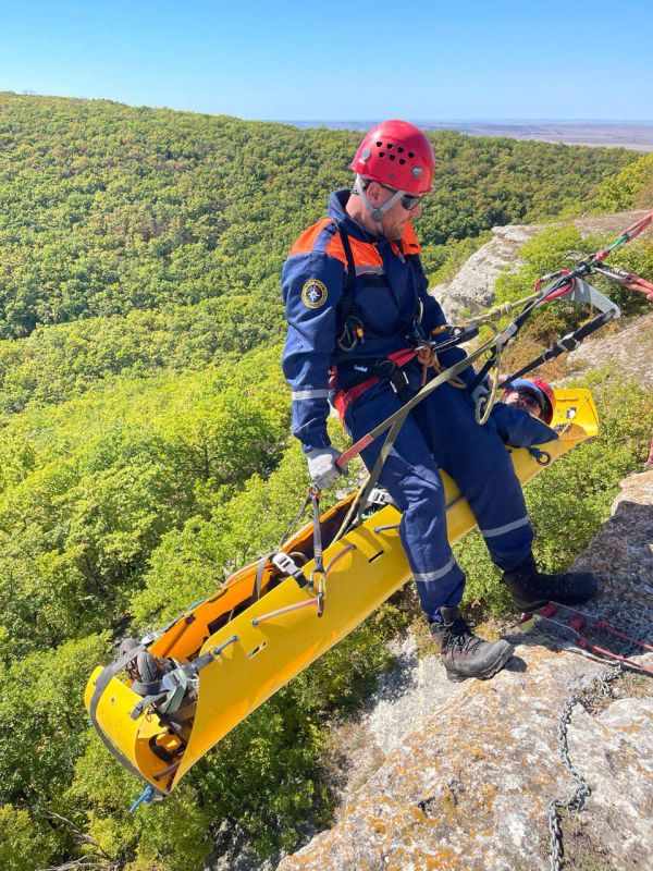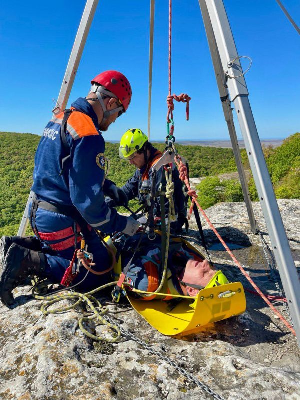 Спасатели, используя альпинистское снаряжение, трипод и спецносилки, отработали приёмы эвакуации условного пострадавшего со скалы высотой около 30 метров.