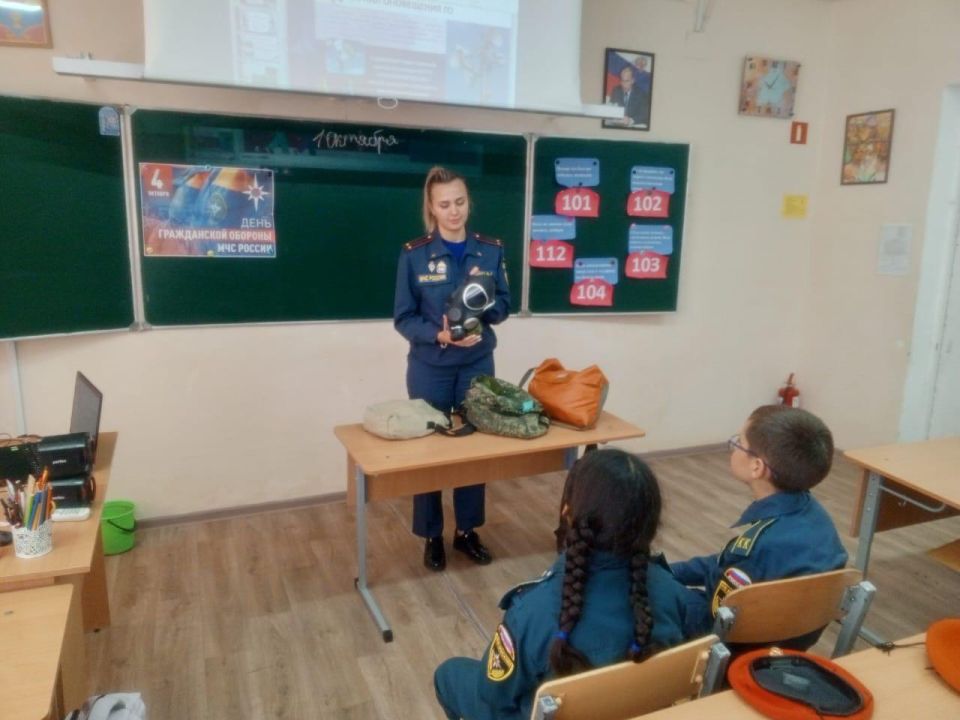Специалисты рассказали школьникам об истории создания и развитии системы гражданской обороны России, познакомили со средствами и способами защиты населения в случае возникновения опасных ситуаций.
