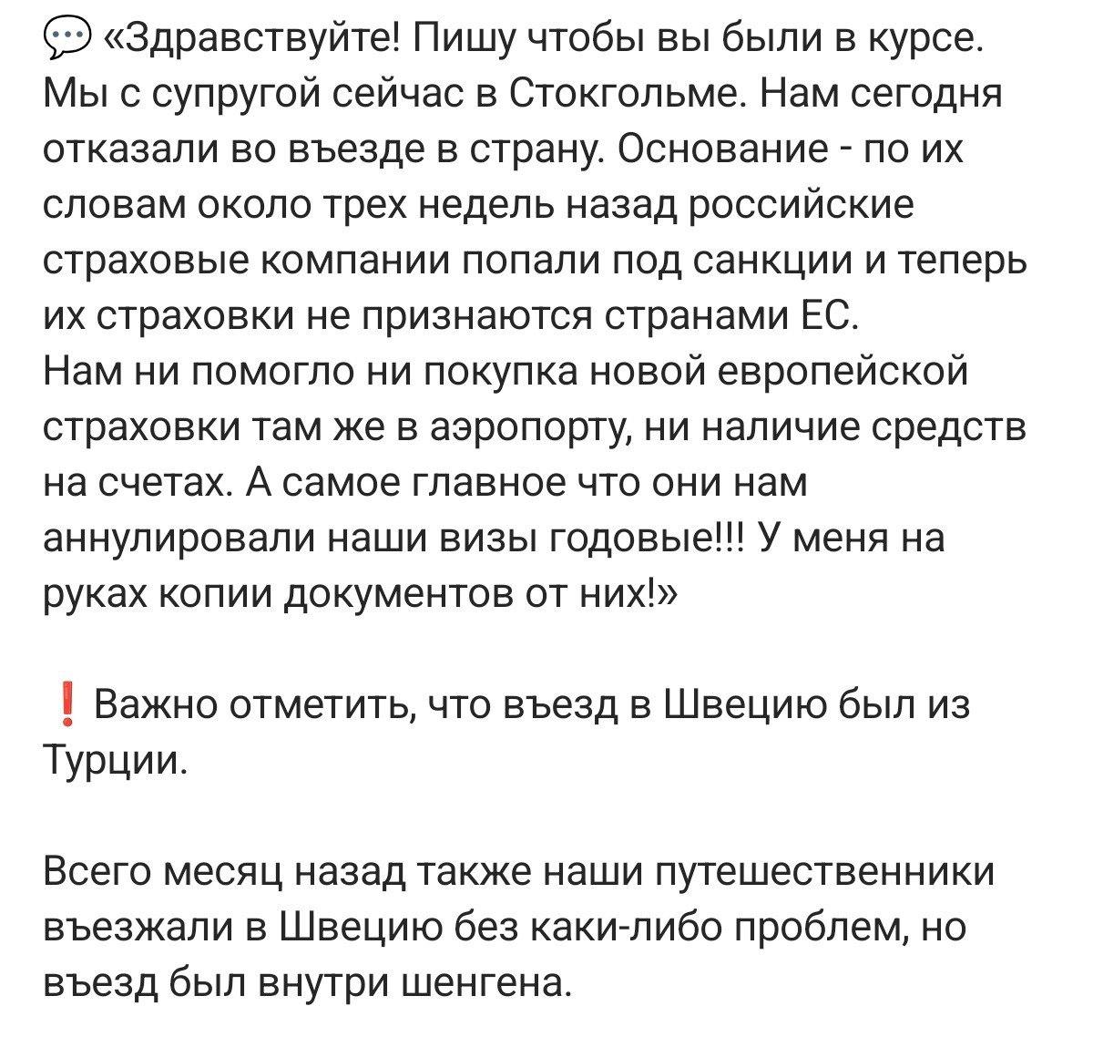 Юрий Котенок: Сенсация! Сенсация! Швеция начала аннулировать визы россиянам, о чем россияне, успевшие попасть в Швецию, предупреждают остальных