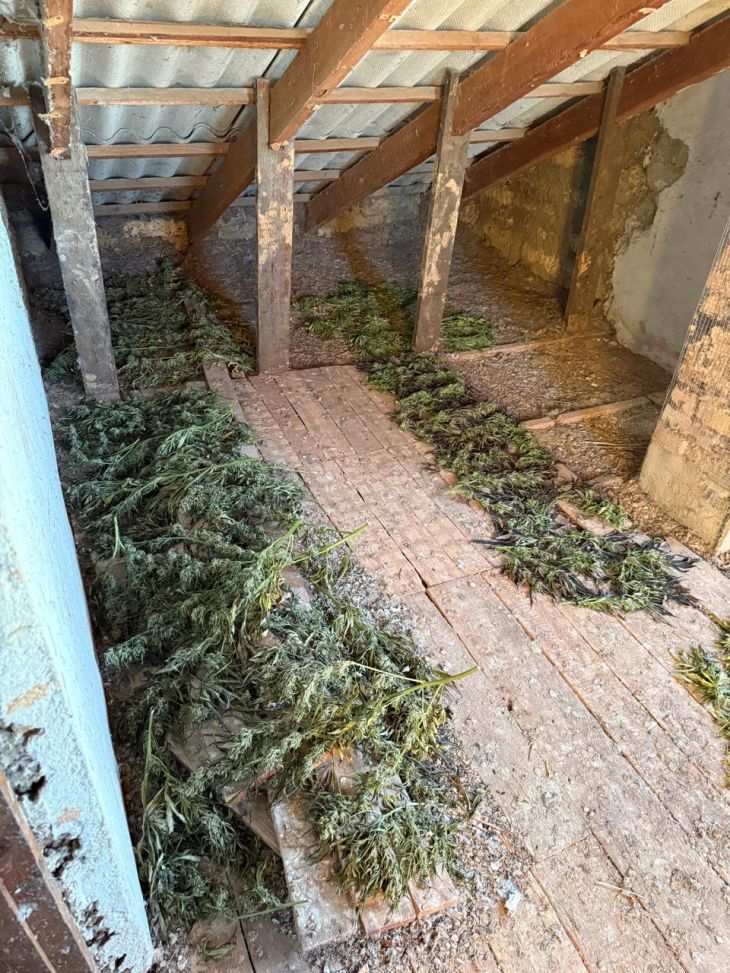 В результате осмотра были обнаружены высушенные части растений конопли. Некоторые из них находились в подвешенном состоянии под потолком, другие были разложены на полу. Кроме того, в помещении были найдены стеклянная емкость и полимерный пакет, содержащие сухое вещество, предположительно являющееся марихуаной.
