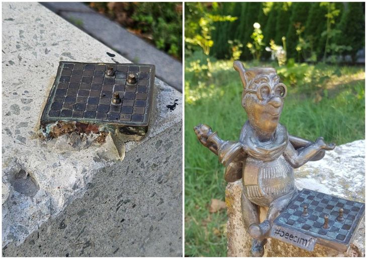 Злоумышленники использовали кувалду, чтобы разбить скульптуры. В результате их действий были уничтожены фигурки шахматиста и речной нимфы, входившие в композицию.
