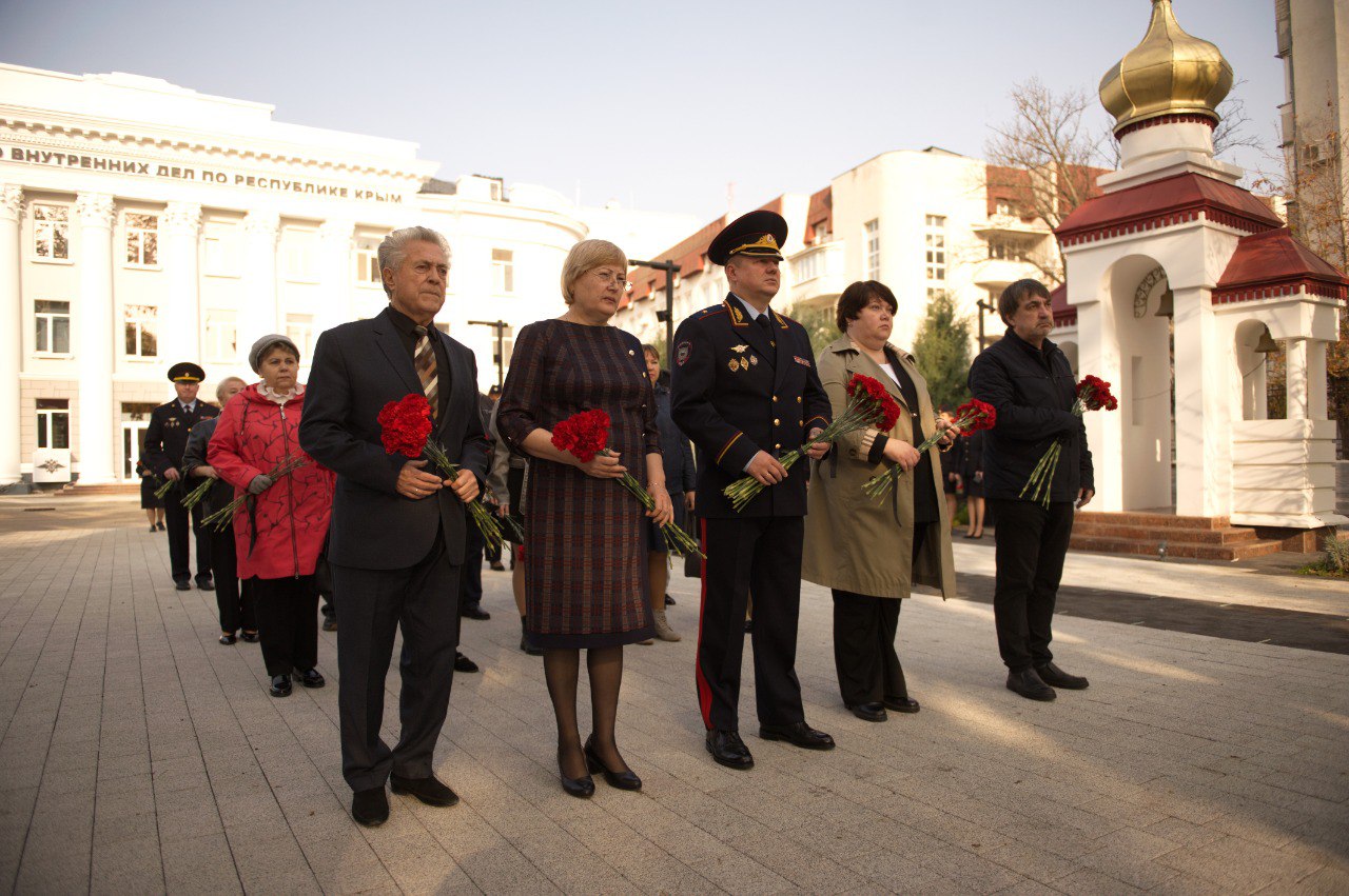 Под звуки оркестра Культурного центра во главе с Министром внутренних дел по Республике Крым генерал-майором полиции Алексеем Дмитриевым руководство и личный состав ведомства почтили память своих погибших коллег.