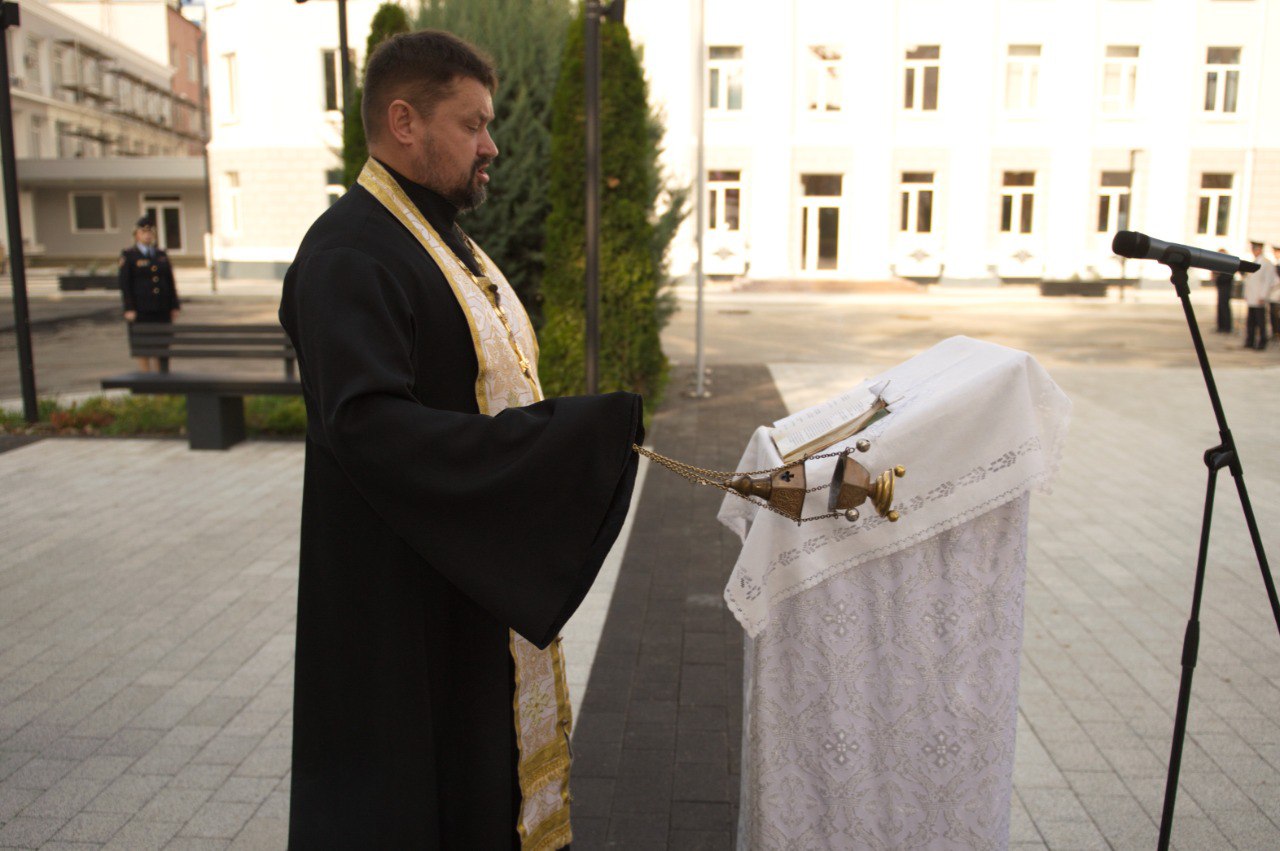 Возле храма-часовни святого Георгия Победоносца, расположенного на территории Министерства прошла панихида. Службу по погибшим провел отец Олег.