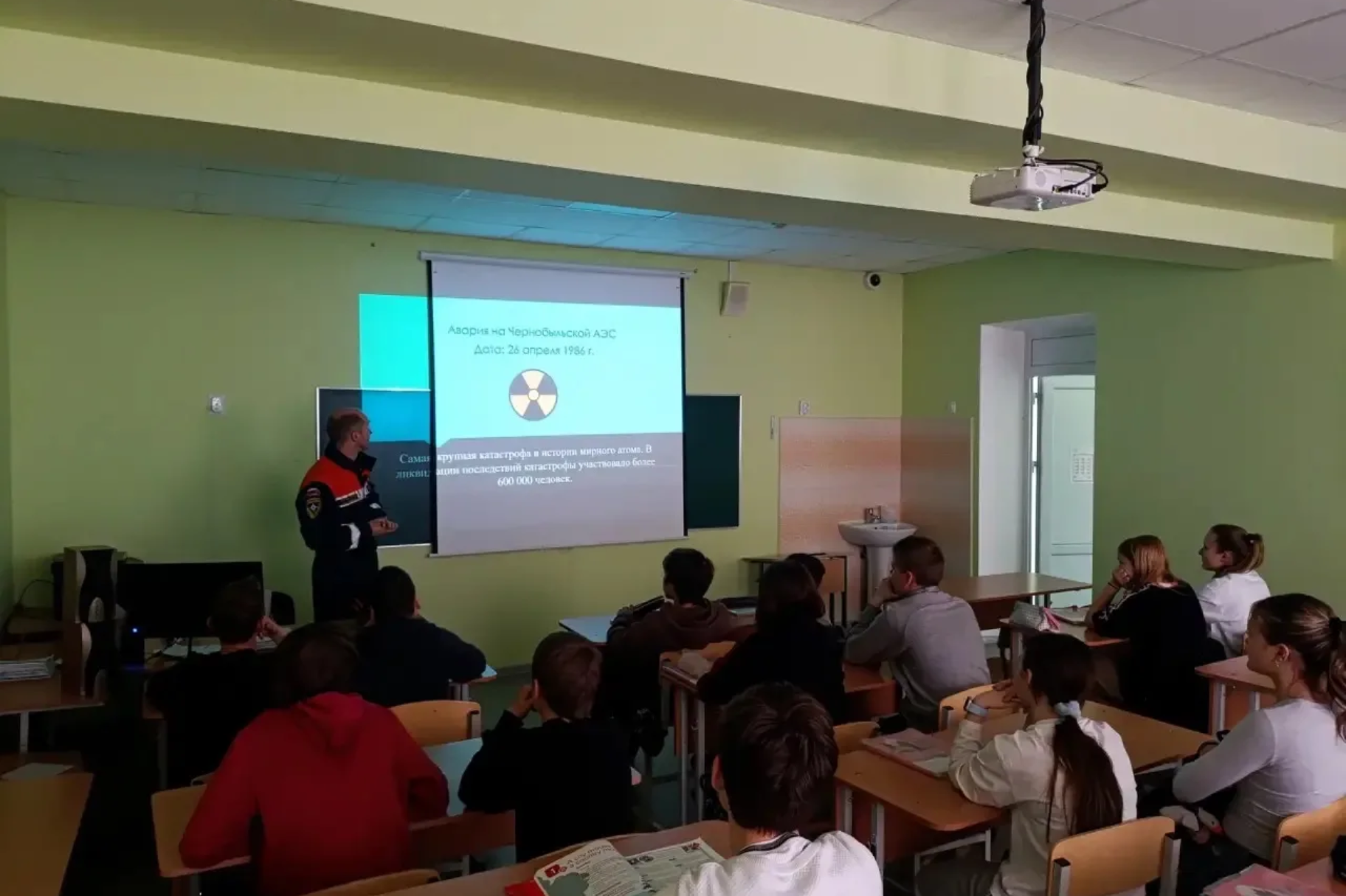 Спасатели рассказали школьникам о трагедии, случившейся близ города Припять в четвёртом энергоблоке Чернобыльской АЭС. Дети узнали о том, что активная зона реактора была полностью разрушена, а в окружающую среду выброшено большое количество радиоактивных веществ.