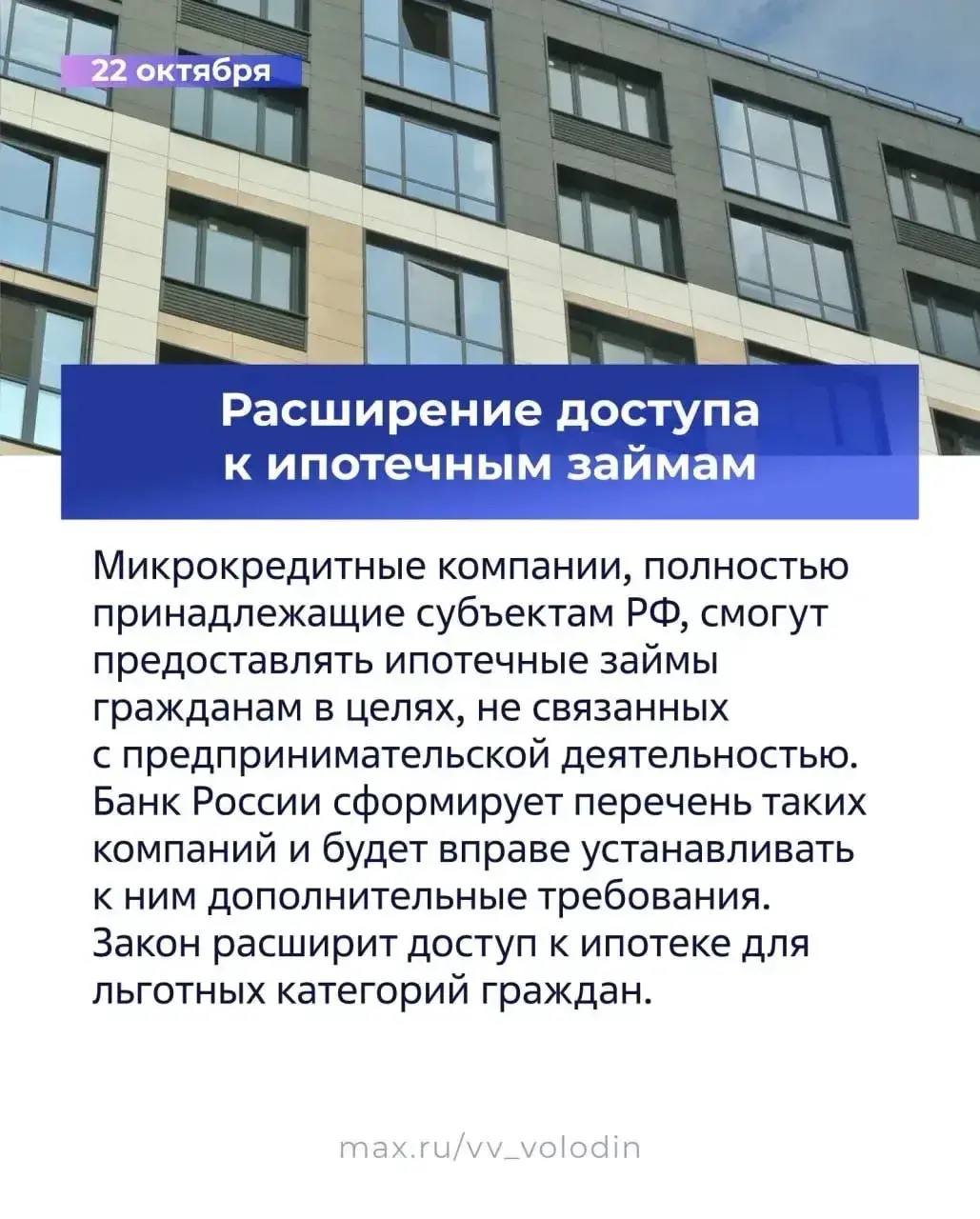 Микрокредитные компании, полностью принадлежащие субъектам Российской Федерации, получают право предоставлять ипотечные займы гражданам для целей, не связанных с предпринимательской деятельностью.