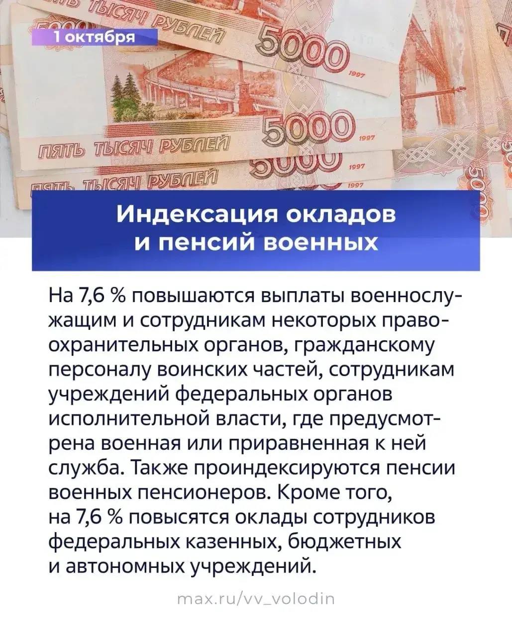 Денежное довольствие военнослужащих и оклады бюджетников увеличиваются на 7,6%. Повышение затронет следующие категории: