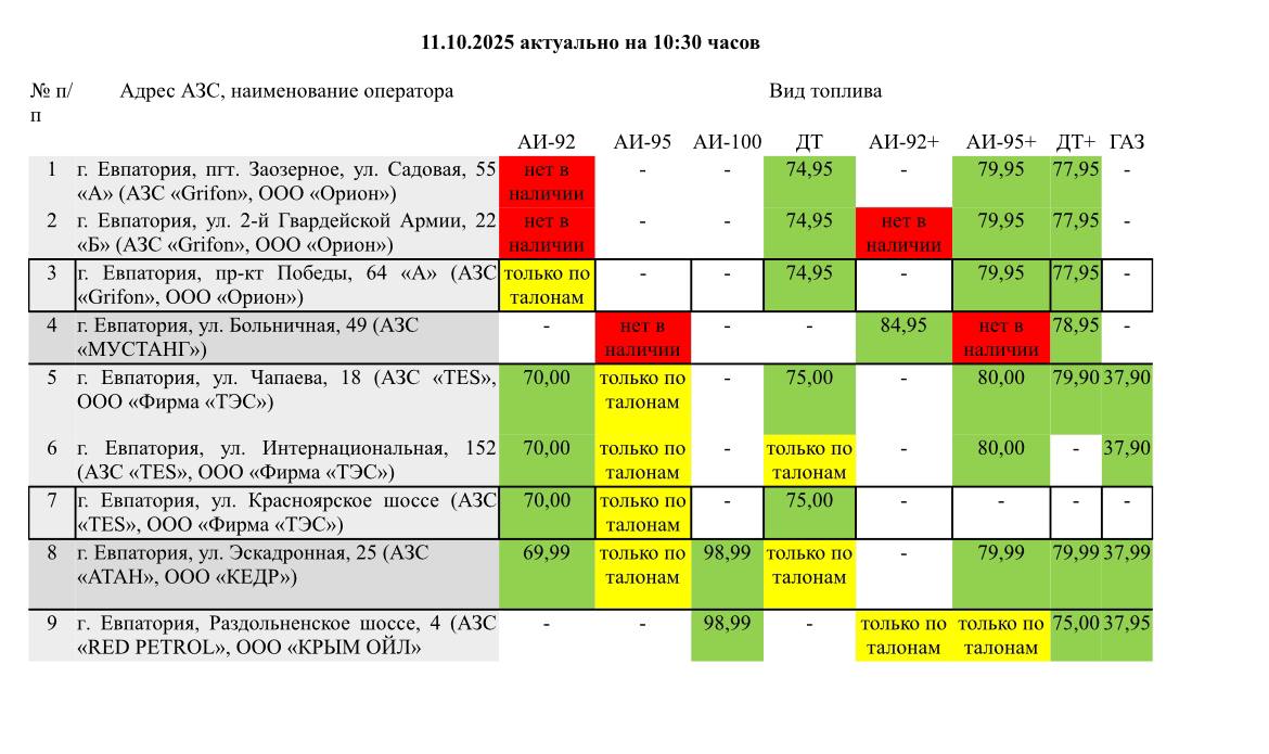 Публикуем актуальные данные о наличии топлива на АЗС Евпатории на 10:30 11 октября 2025 года.