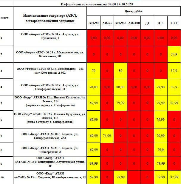 Уважаемые алуштинцы! Важная информация о наличии топлива в нашем муниципалитете по состоянию на 08:00 14.10.2025.