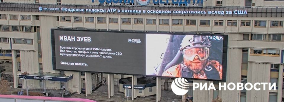 Фото погибшего военкора Ивана Зуева появилось на медиафасаде здания медиагруппы "Россия Сегодня" в центре Москвы.