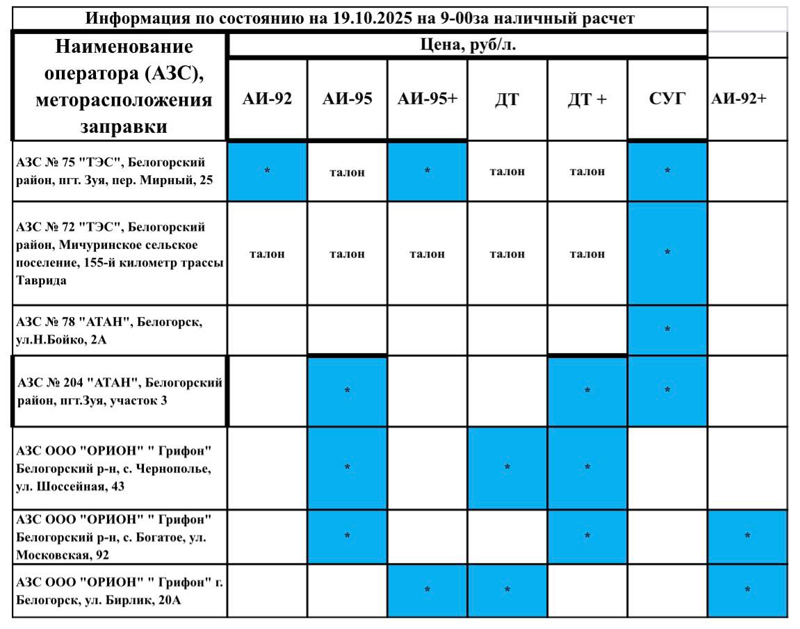 Актуальная информация по наличию топлива на АЗС в Белогорском районе по состоянию на 09.00 19 октября.