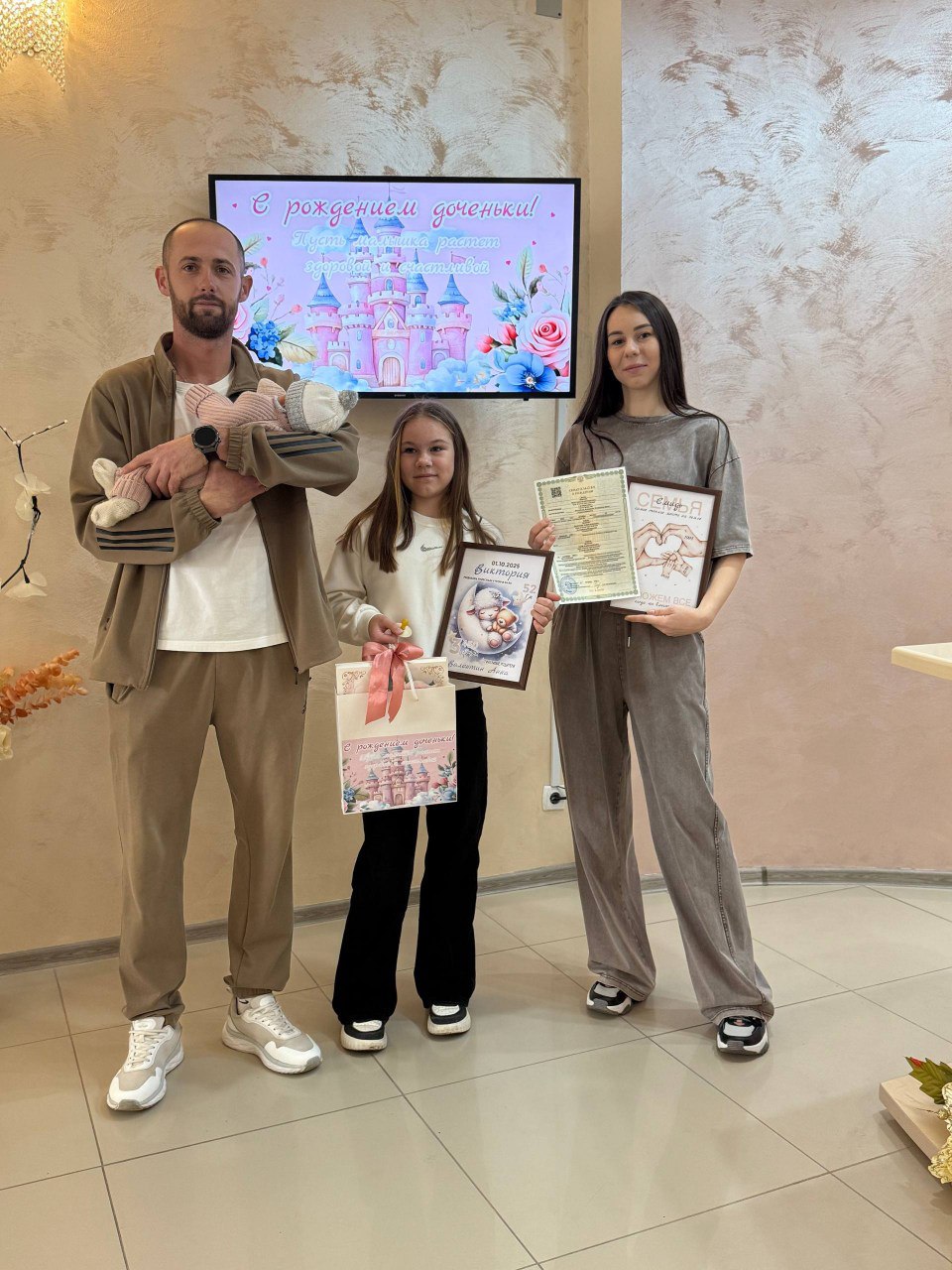 Сотрудники отдела ЗАГС торжественно поздравили счастливых родителей и старшую сестру новорожденной, вручив им свидетельство о рождении – главный документ малышки, а также традиционные памятные подарки с пожеланиями мира, добра и процветания.