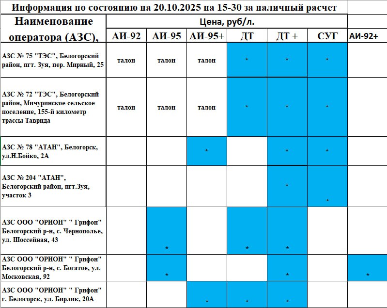 Актуальная информация по наличию топлива на АЗС в Белогорском районе по состоянию на 15.30 20 октября.
