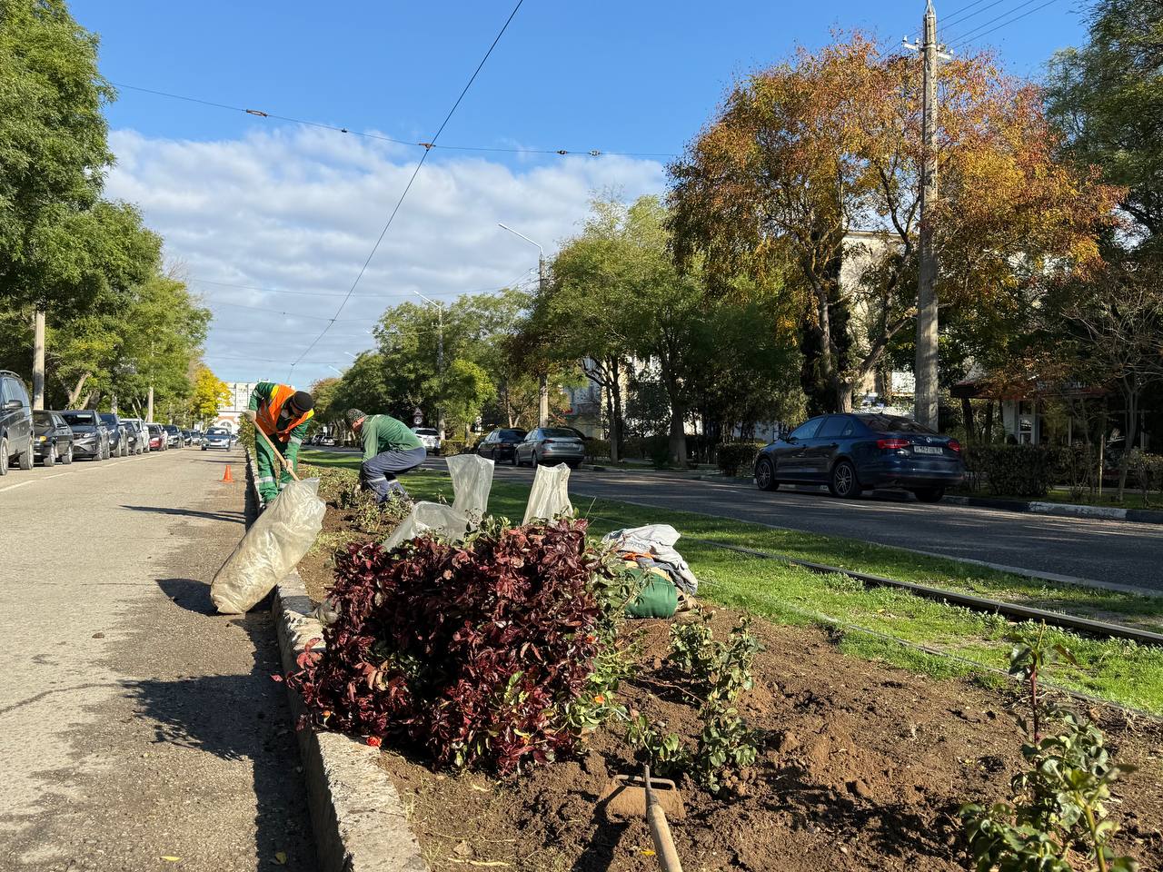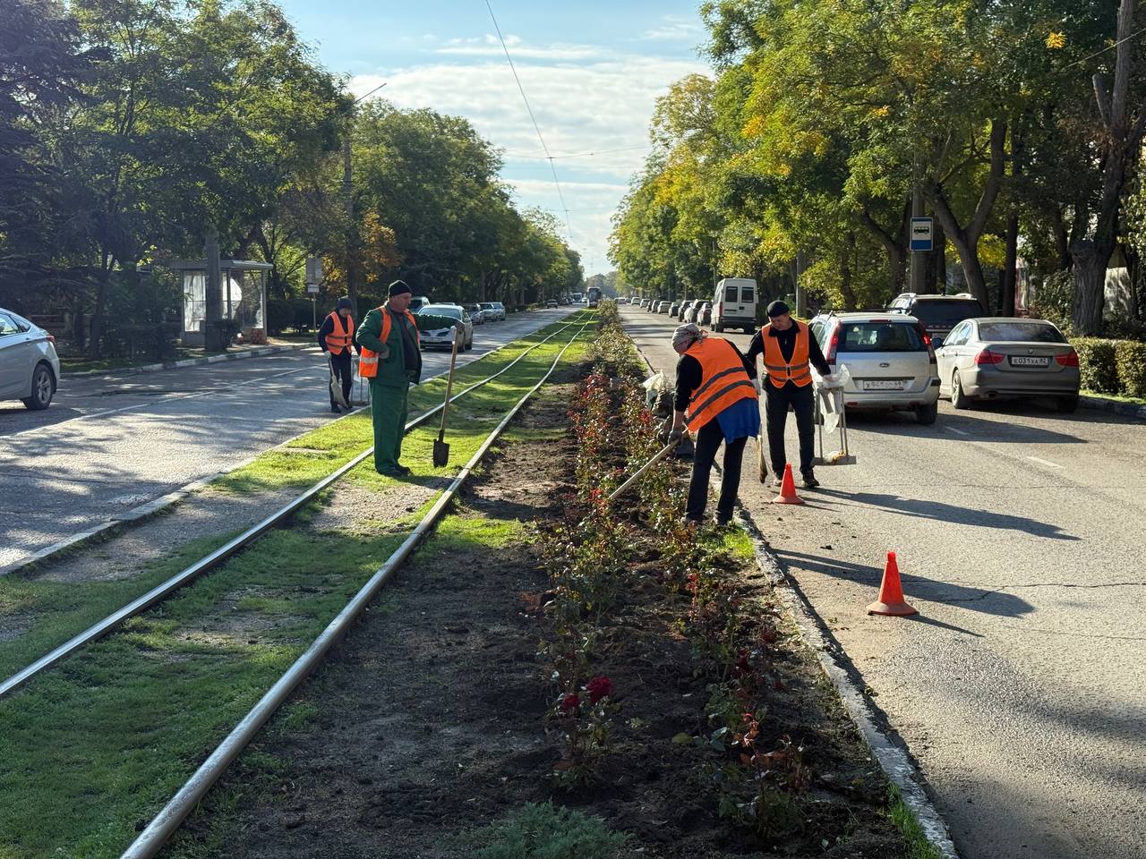 В Евпатории на улице Фрунзе высаживают розы вдоль трамвайной линии