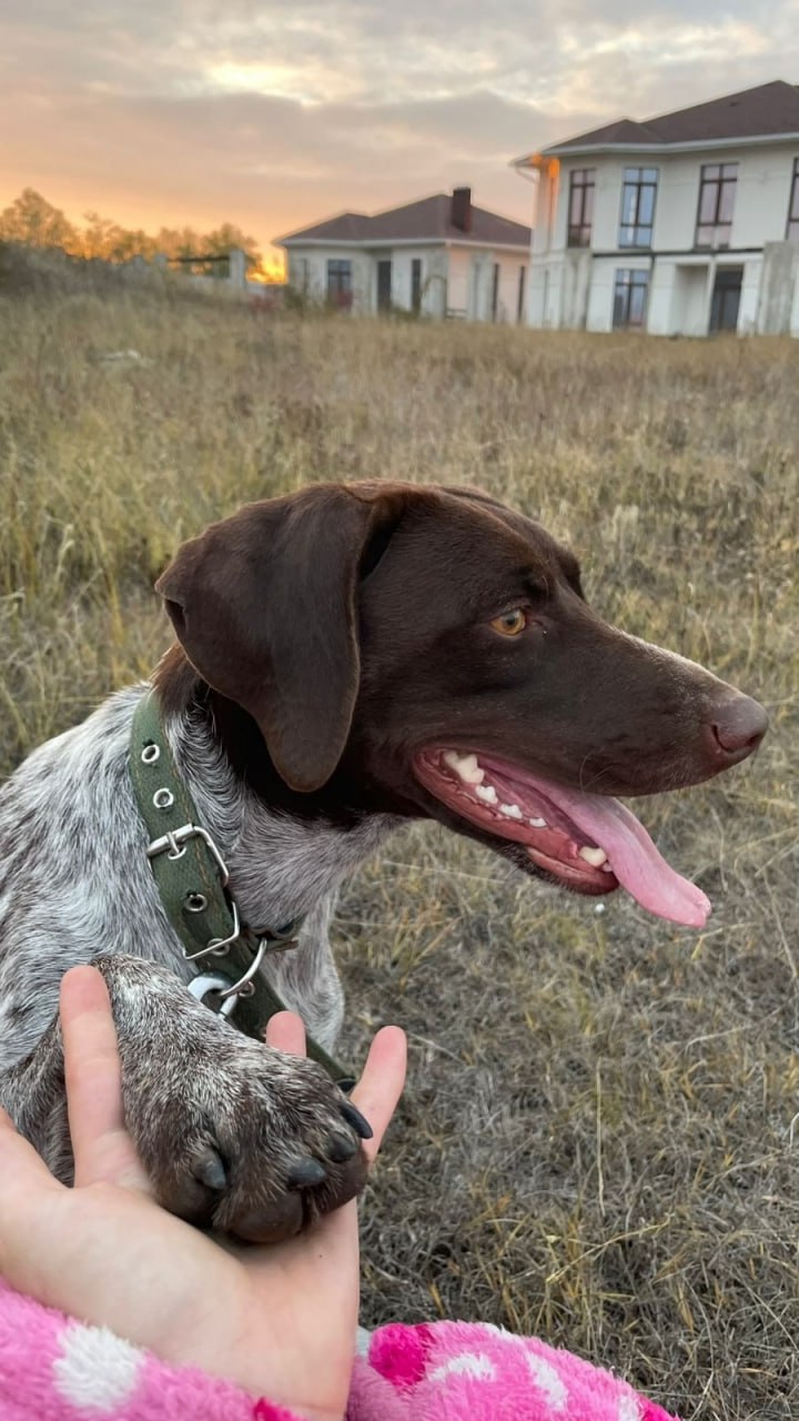 Курцхаар Жозефина, будучи щенком, прибилась к военному лагерю и прожила там полтора года. За это время у неё появились малыши.