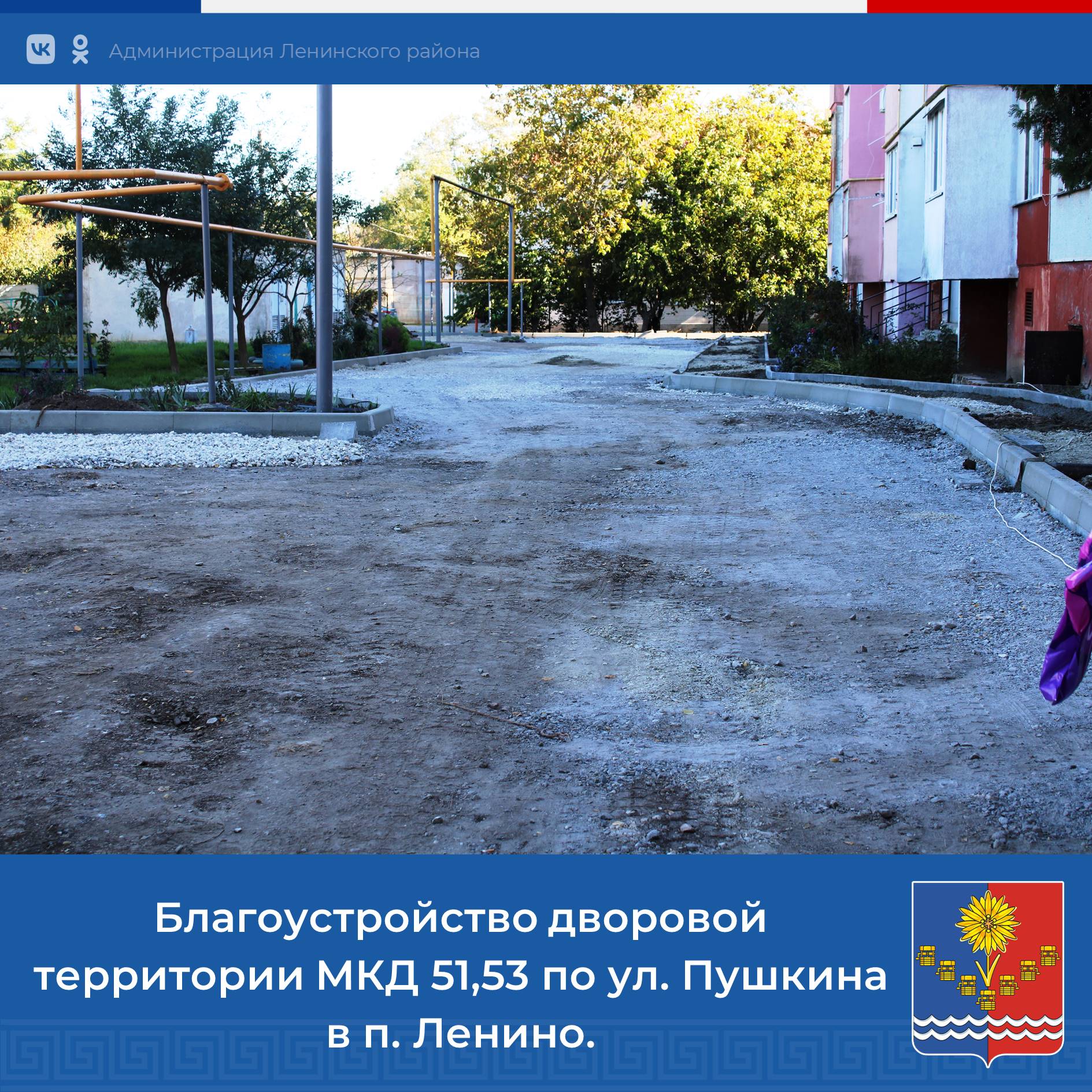 В поселке Ленино проводится капитальный ремонт дворовой территории многоквартирных домов № 51 и 53, расположенных по улице Пушкина, с целью улучшения благоустройства.