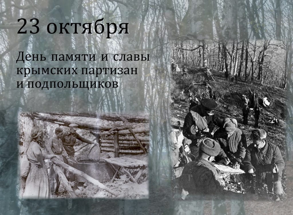 23 октября в Крыму отмечают знаковую дату – День Памяти и Славы Крымских партизан и подпольщиков. Именно в этот день в 1941 году был создан Штаб партизанского движения Крыма, ставший началом самоотверженной борьбы наших жителей в тылу врага, партизанского движения крымчан против ненавистных немецких оккупантов на полуострове.