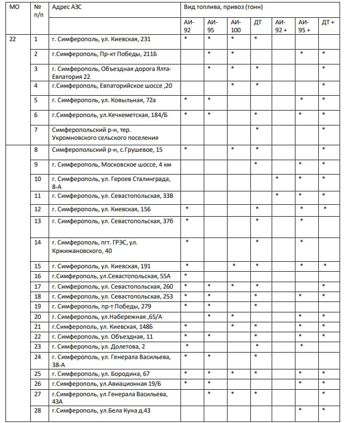 Актуальный перечень адресов АЗС в городе Симферополе, где имеется топливо в свободной продаже (*Данные актуальны на 25.10.2025 года 08:00)
