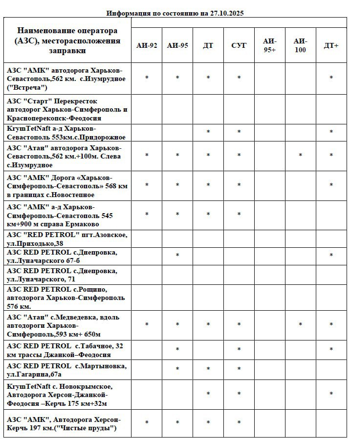 Делюсь с вами актуальной информацией о наличии топлива на АЗС Джанкойского района по состоянию на 27.10.2025 на 09:00