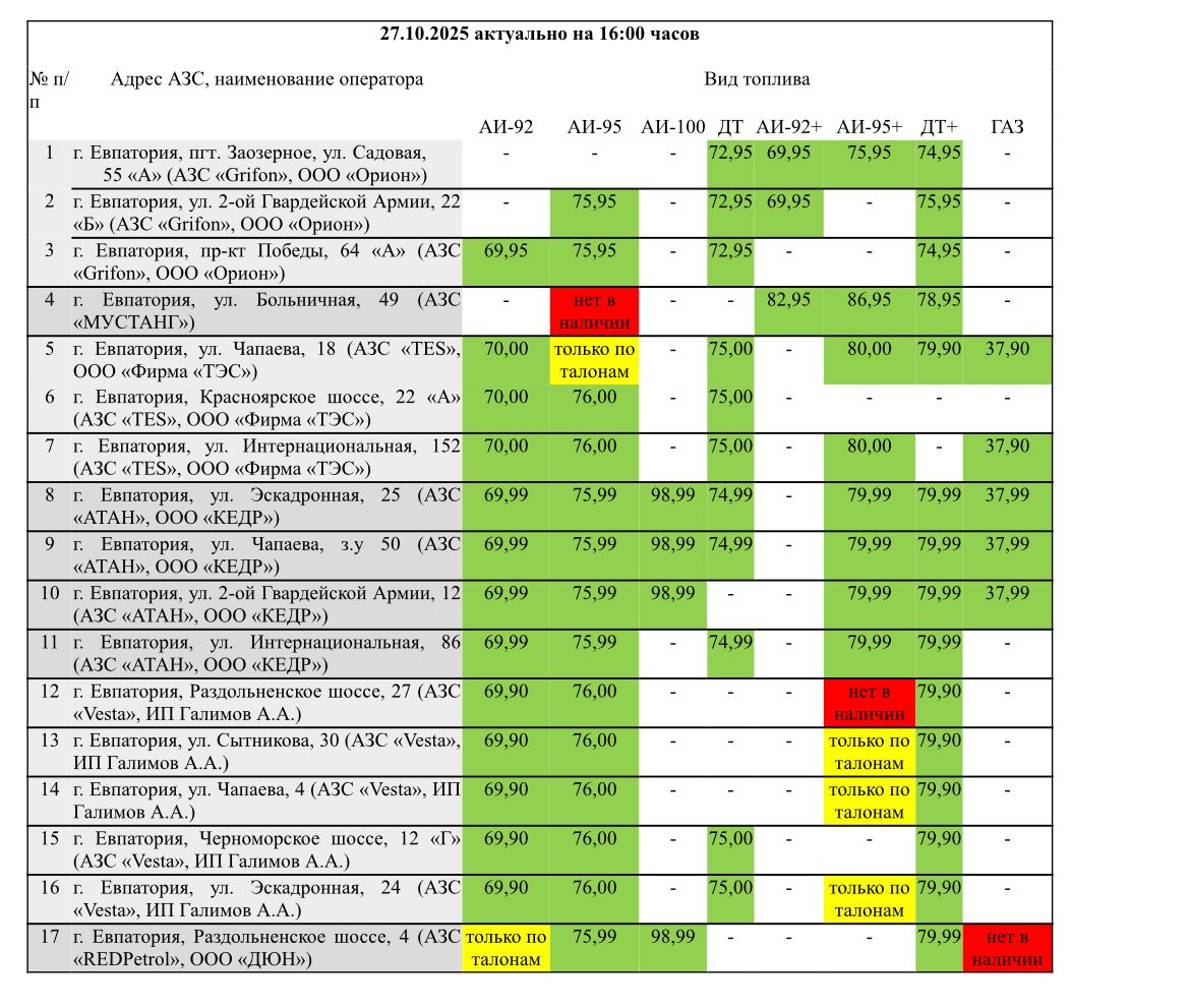Публикуем данные о наличии топлива на АЗС Евпатории.