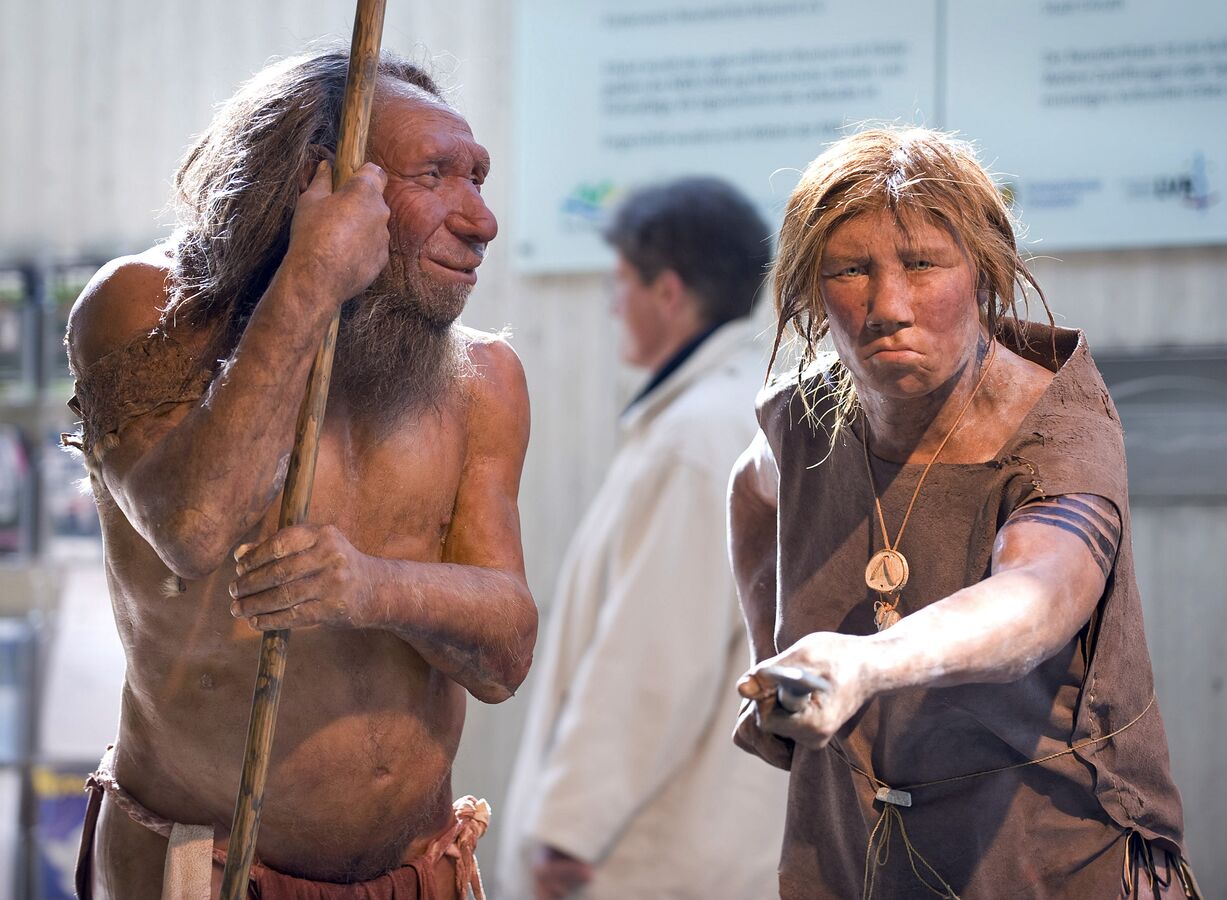 Реконструкция первобытных мужчины и женщины в Музее неандертальцев в Меттмане
