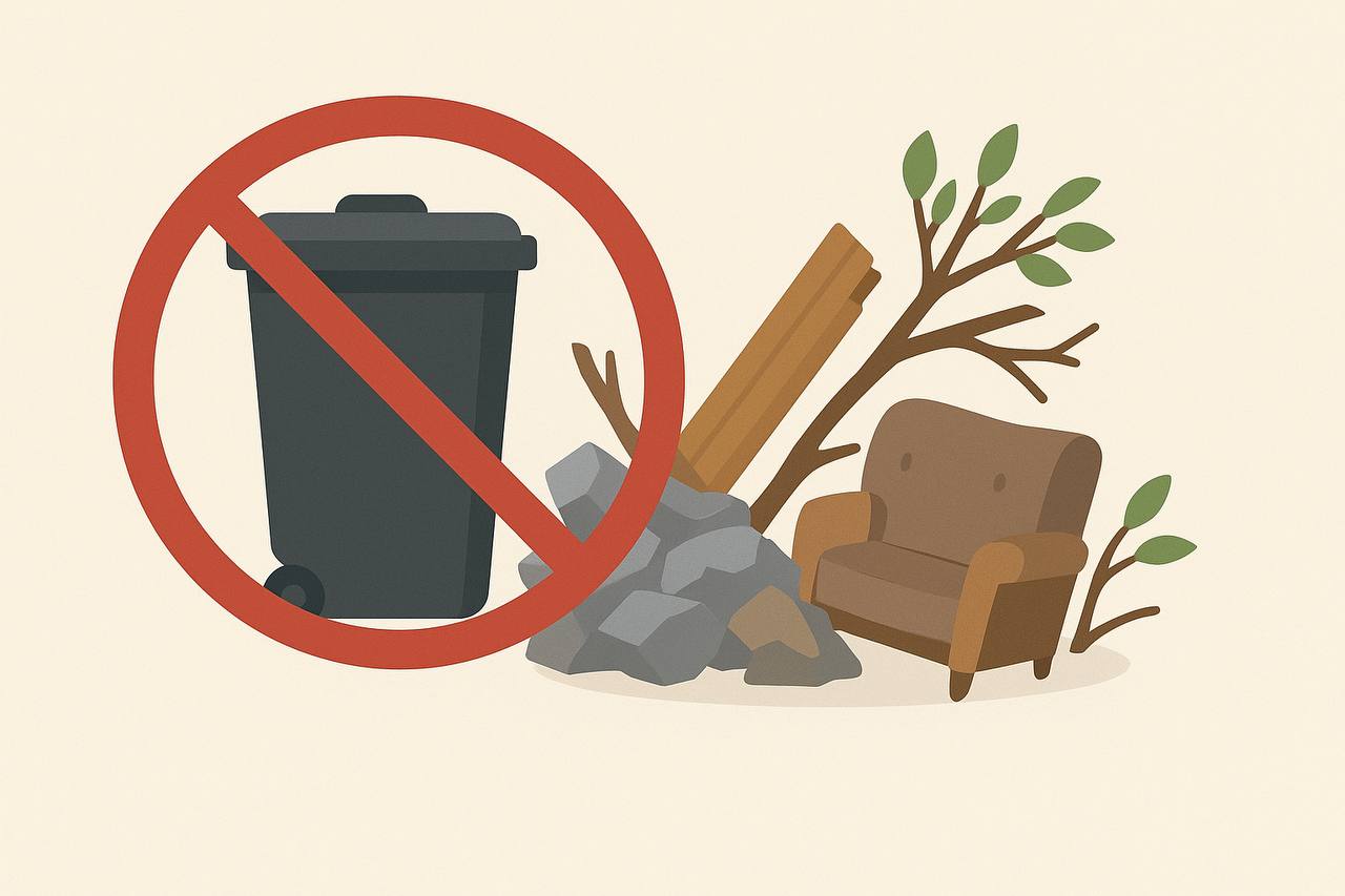 Напоминаю, что строительный мусор, ветки, листья, старую мебель и другие габаритные отходы нельзя выбрасывать в обычные мусорные баки! Такие отходы засоряют контейнерные площадки и мешают вывозу бытового мусора.