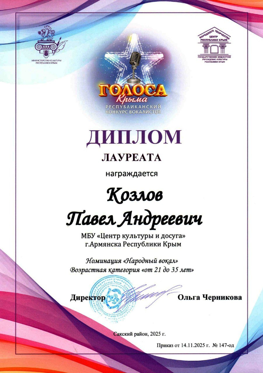 Поздравляю солиста Центра культуры и досуга Армянска Павла Козлова, ставшего Лауреатом конкурса в номинации "Народный вокал" IX Республиканского конкурса вокалистов "Голоса Крыма", проходившего в Республике Крым!