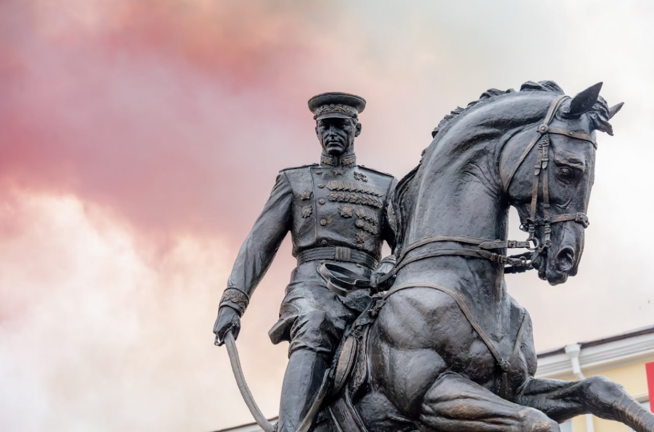 Как и обещал, РВИО установило памятник К.Рокоссовскому в Гомеле. Маршал командует Парадом Победы. Стилизованная брусчатка Красной площади и поверженные нацистские штандарты.