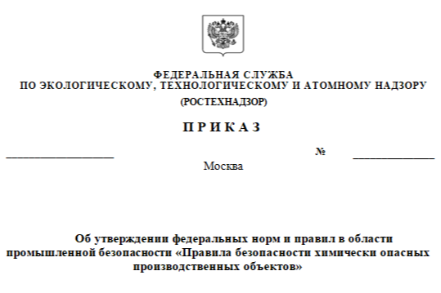 Федеральной службой по экологическому, технологическому и атомному надзору разработан проект новых федеральных норм и правил в области промышленной безопасности «Правила безопасности химически опасных производственных объектов». На данном этапе проект правил проходит публичное обсуждение текста проекта нормативного правового акта. Согласно проекта, приказ вступит в силу с 1 января 2027 года и будет действовать