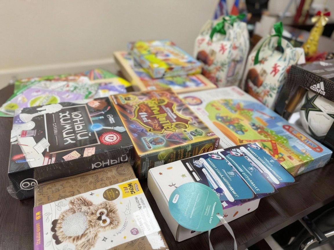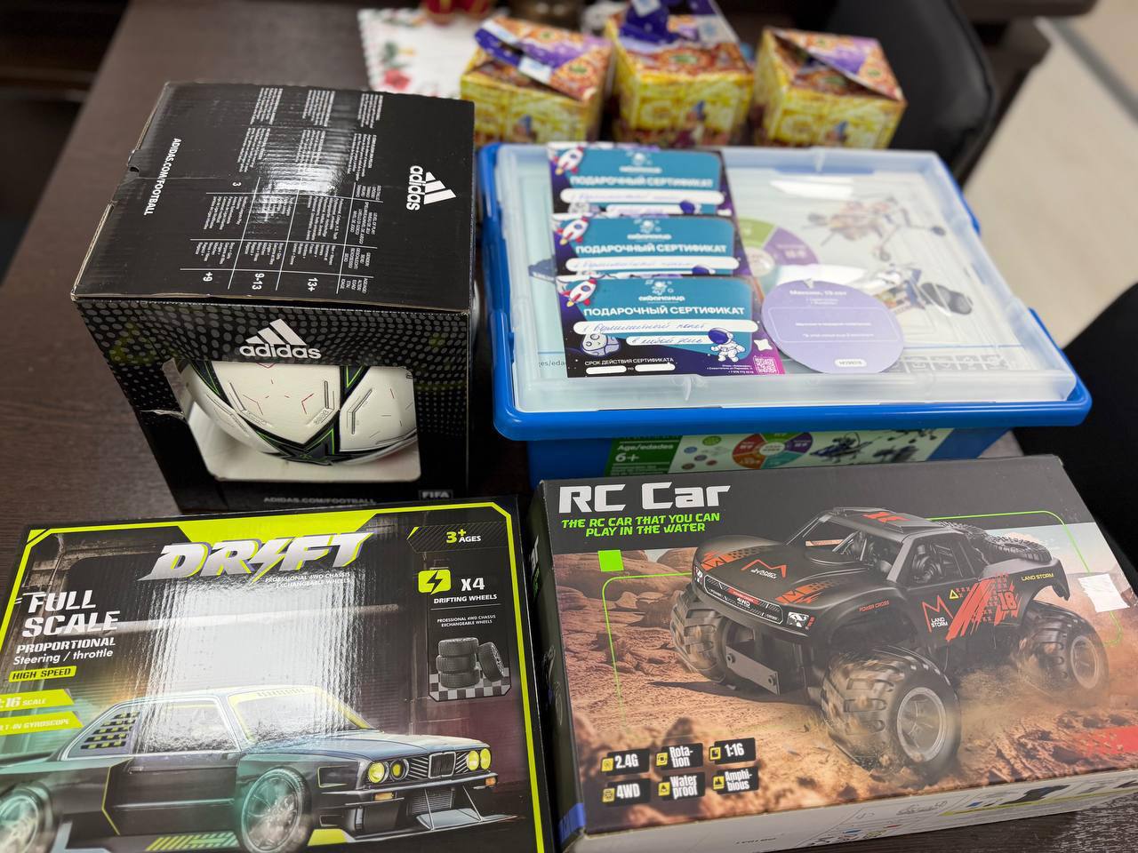 Подросток и его младшие братья получили дрифт-машинки, электронный конструктор, футбольный мяч, сладости и сертификаты в активити-парк «Аквамания».Владимиру и его брату с сестрой подарили наборы для экспериментов, настольные игры, футбольный мяч, сладкие подарки и сертификаты в активити-парк «Аквамания».