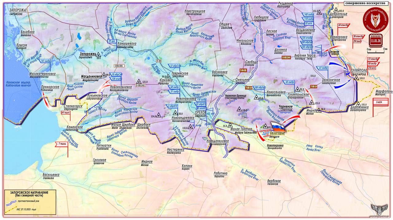 11 января 2026 года был освобожден н.п. Белогорье (47°3132 с. ш. 35°5929 в. д. - население около 250 чел. в 2019 г.).