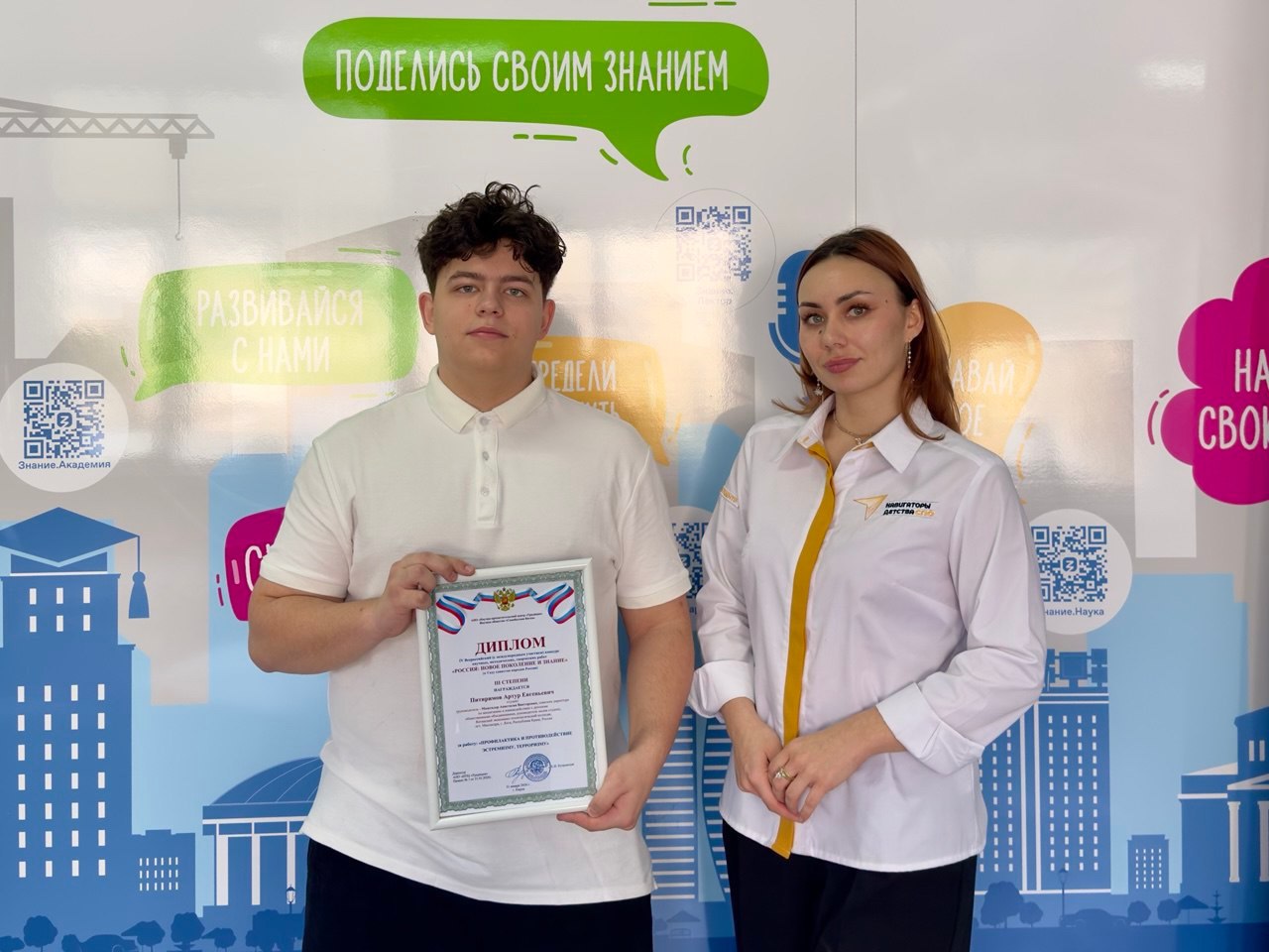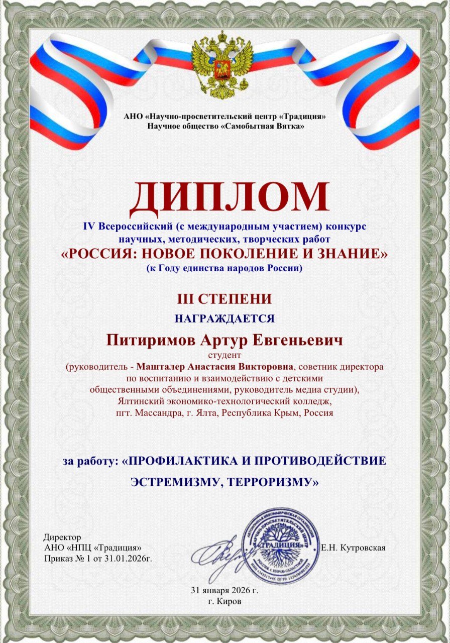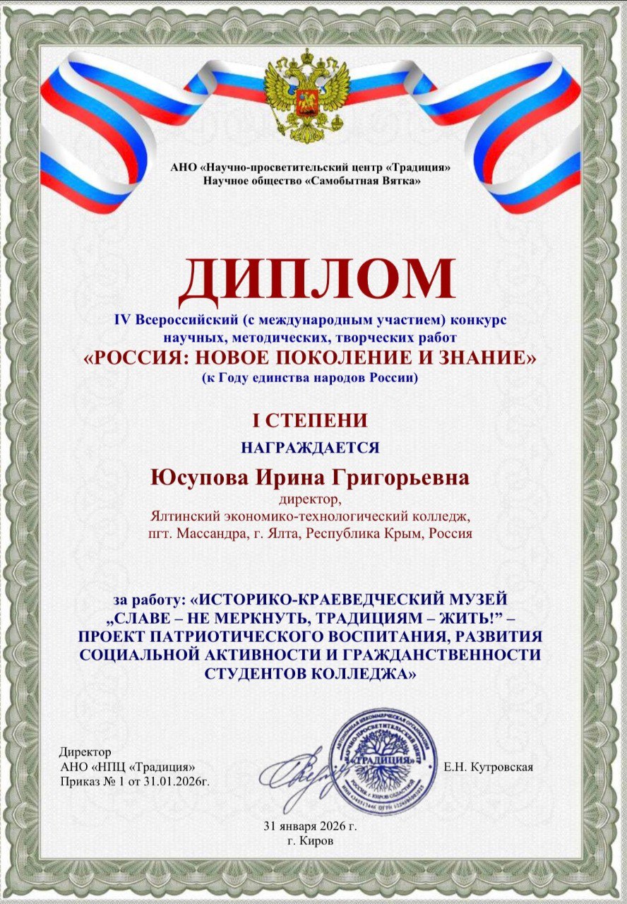 Республику Крым на четвертом всероссийском конкурсе научных, методических и творческих работ «РОССИЯ: НОВОЕ ПОКОЛЕНИЕ И ЗНАНИЕ» представили директор ГБПОУ РК «ЯЭТК» Ирина Юсупова и студент группы № 350 по специальности «Поварское и кондитерское дело» Артур Питиримов и советник директора по воспитанию и взаимодействию с детскими общественными объединениями, руководитель медиа студии ГБПОУ РК «ЯЭТК» Анастасия Машталер.