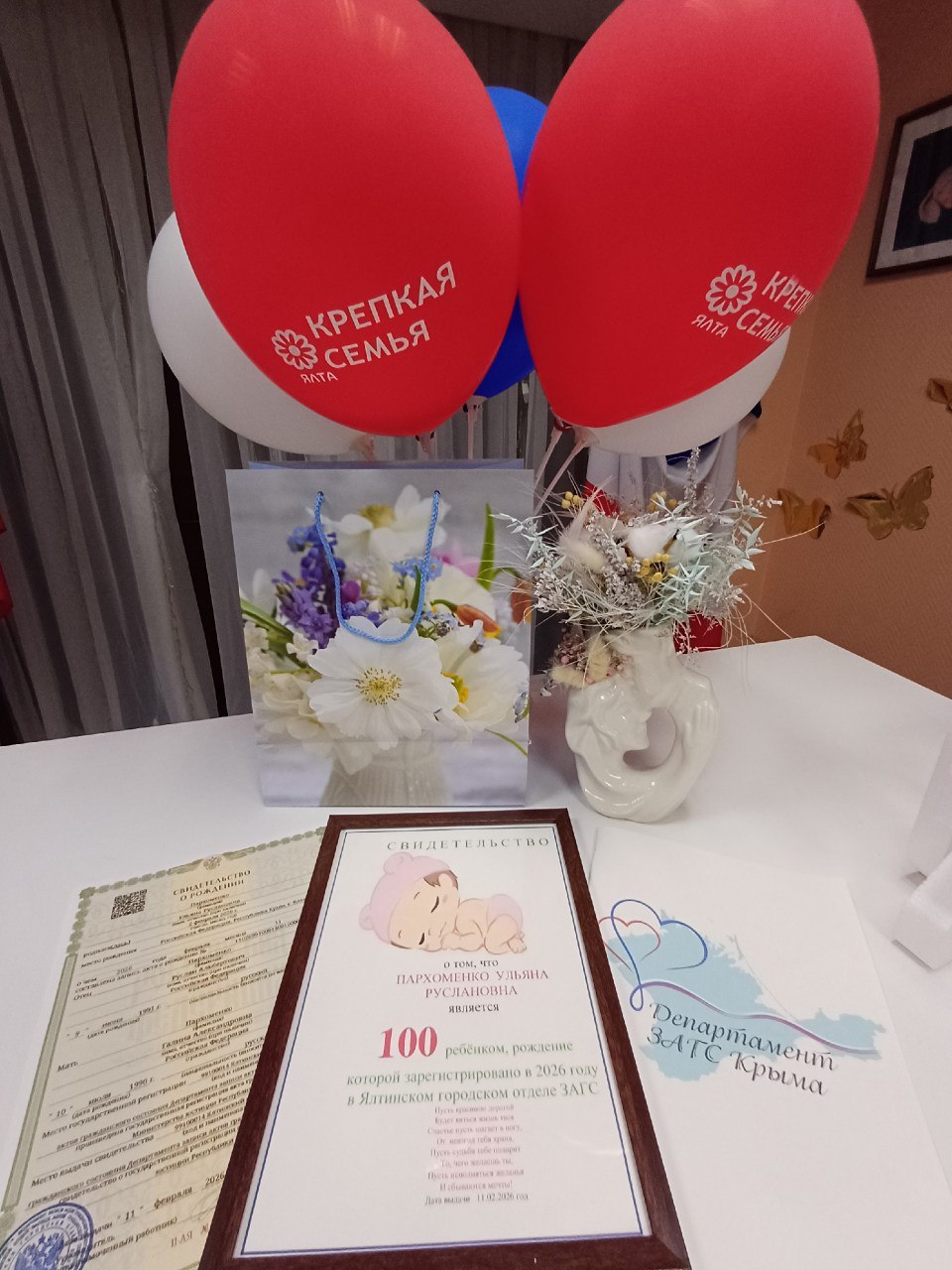 Ялтинский городской отдел ЗАГС торжественно зарегистрировал «юбилейное» рождение с начала 2026 года. По этому случаю сотрудники отдела провели церемонию вручения свидетельства о рождении.