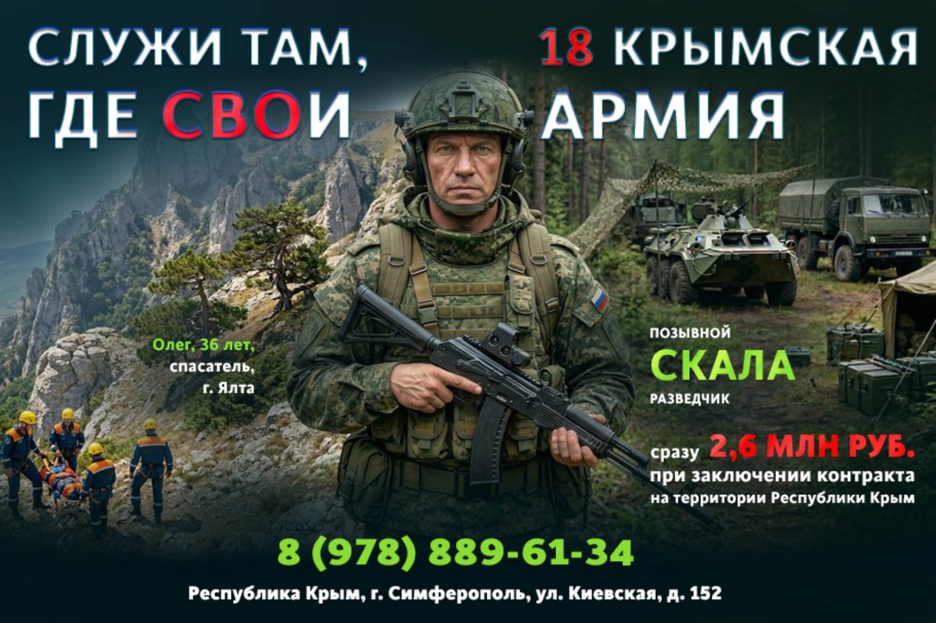 По всем вопросам необходимо обращаться в пункт отбора на военную службу по контракту: Республика Крым, г. Красноперекопск, ул. Калинина, 9. г. Симферополь, ул. Киевская, 152, тел.: +7 (3652) 66-85-71, +7 (978) 889-61-34.