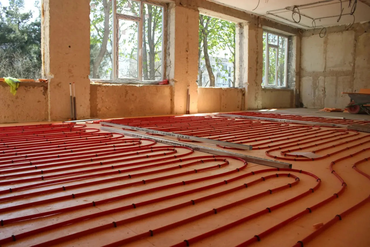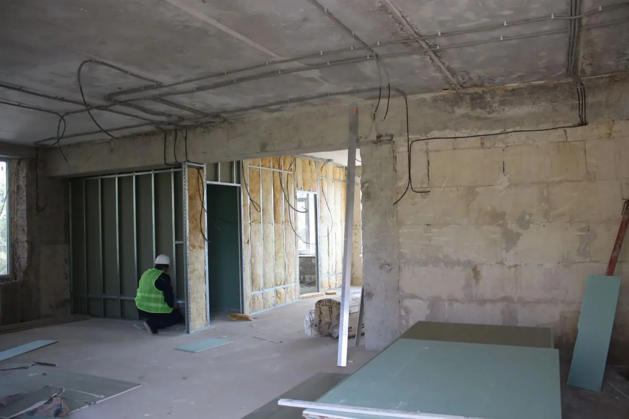 На объекте одновременно ведутся разные виды работ: в одних помещениях демонтируют старые конструкции, в других уже устанавливают оконные блоки, выполняют устройство стяжки и внутренних инженерных сетей.