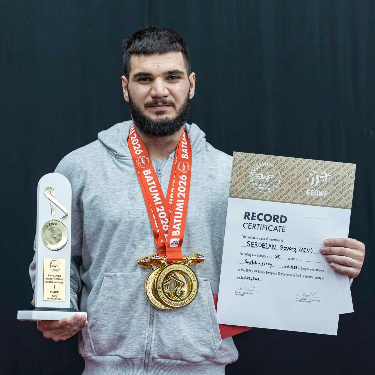 Геворг Серобян на чемпионате Европы в Грузии выступал в весовой категории до 79 кг и показал лучший результат: 180 килограммов в толчке и в сумме — 341 килограмм.