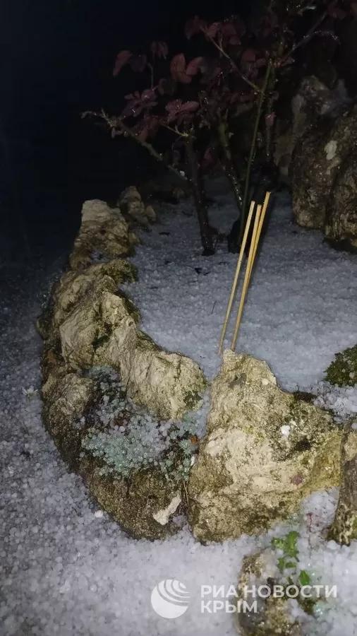 Стихия бушует в Симферополе. Очевидцы делятся в социальных сетях фотографиями выпавшего града размером с горох.