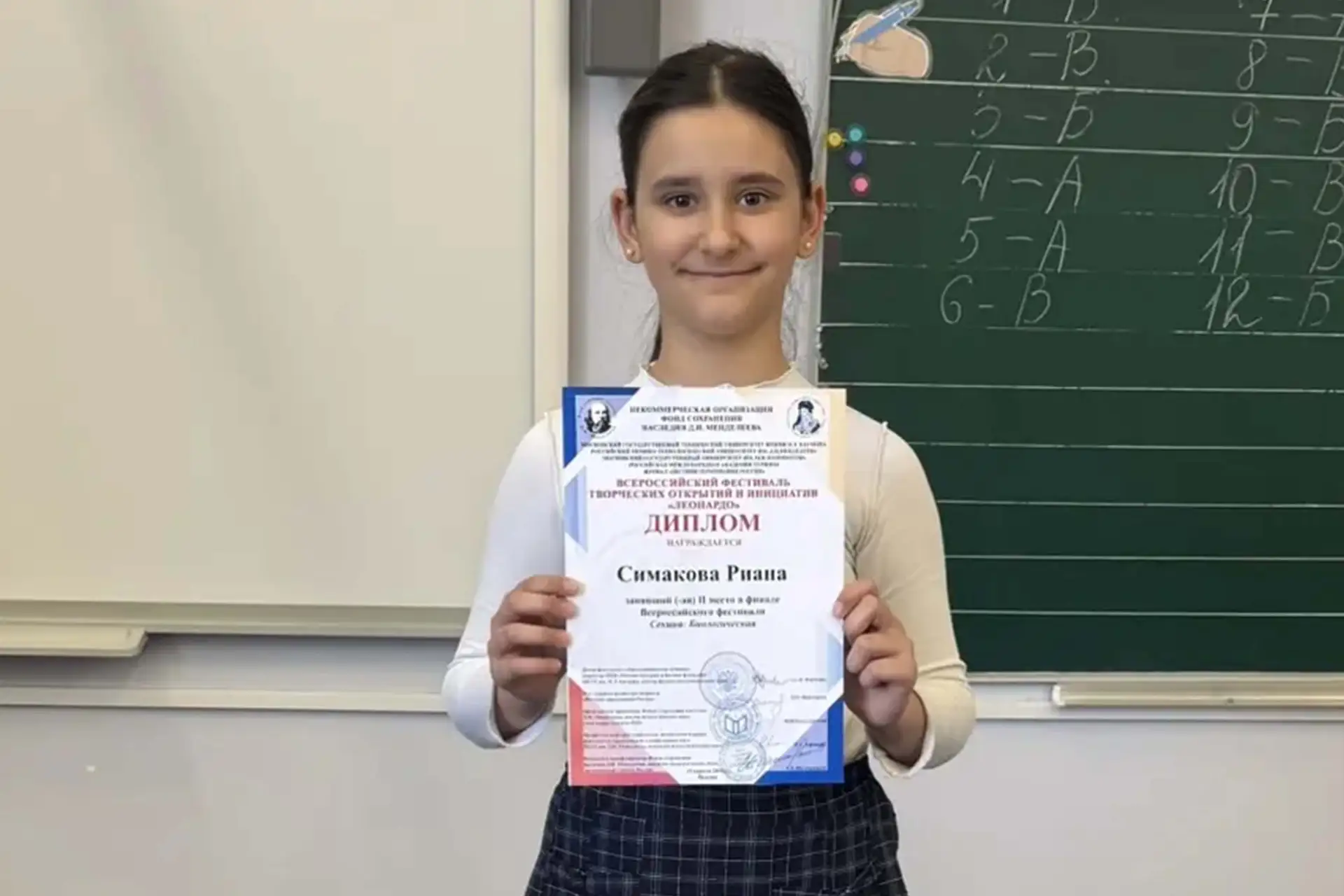 Учащаяся 3-Е класса МБОУ «Лицей Крымской весны» Симакова Реана представила Симферопольский район в финале Всероссийского фестиваля творческих открытий и инициатив «Леонардо». Фестиваль организован Фондом сохранения наследия Д.И. Менделеева и направвен на выявление и поддержку интеллектуально и художественно одарённых учащихся. Реана показала достойный результат, заняв второе место.