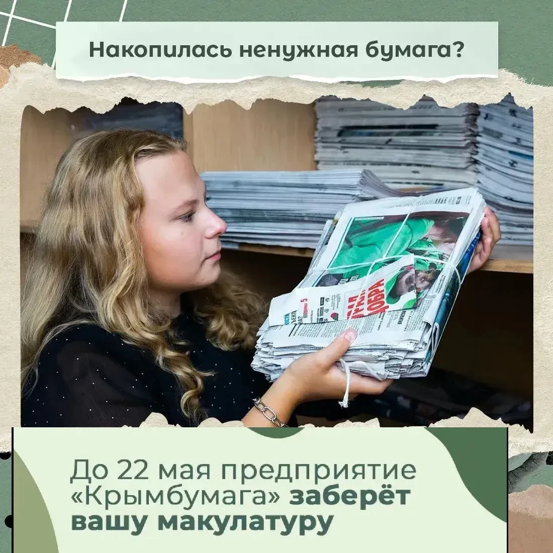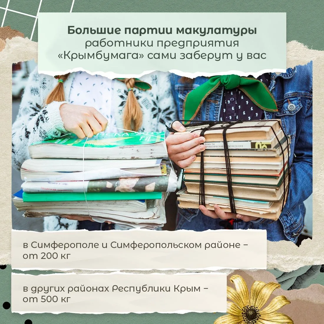 Старые конспекты, черновики, тетради, газеты – всё для сохранения природы. Ведь каждые 100 кг макулатуры спасают одно взрослое дерево. Образовательные организации, органы исполнительной власти, предприятия, учреждения и все неравнодушные крымчане - скорее присоединяйтесь!